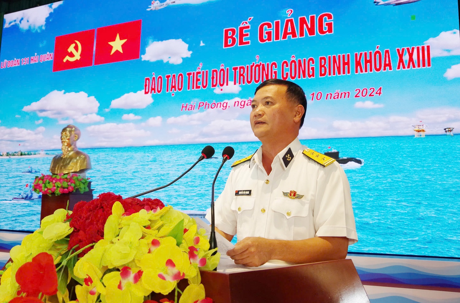 Sáng 10/10, tại Hải Phòng, Lữ đoàn Công binh 131 Hải quân tổ chức bế giảng đào tạo tiểu đội trưởng công binh Khóa 23, năm 2024. Thượng tá Nguyễn Văn Quang, Phó Lữ đoàn trưởng, Tham mưu trưởng chủ trì.