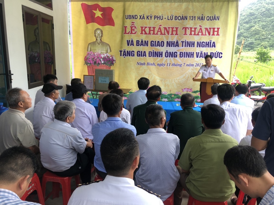 Ngày 11/7, Lữ đoàn Công binh 131 Hải quân phối hợp với Ban Tuyên giáo Tỉnh ủy Ninh Bình tổ chức lễ khánh thành và bàn giao nhà tình nghĩa tặng gia đình ông Đinh Văn Đức ở thôn Bản Cả, xã Kỳ Phú, huyện Nho Quan, tỉnh Ninh Bình.