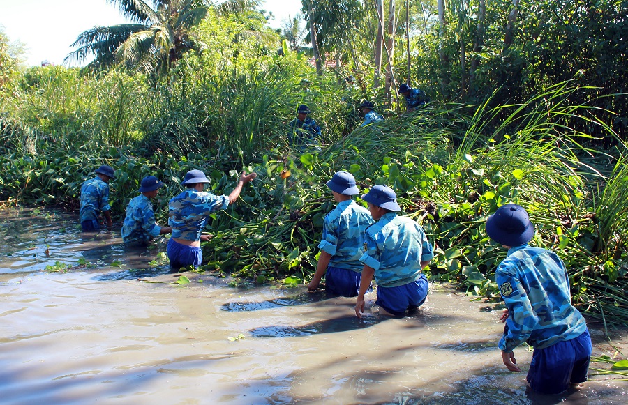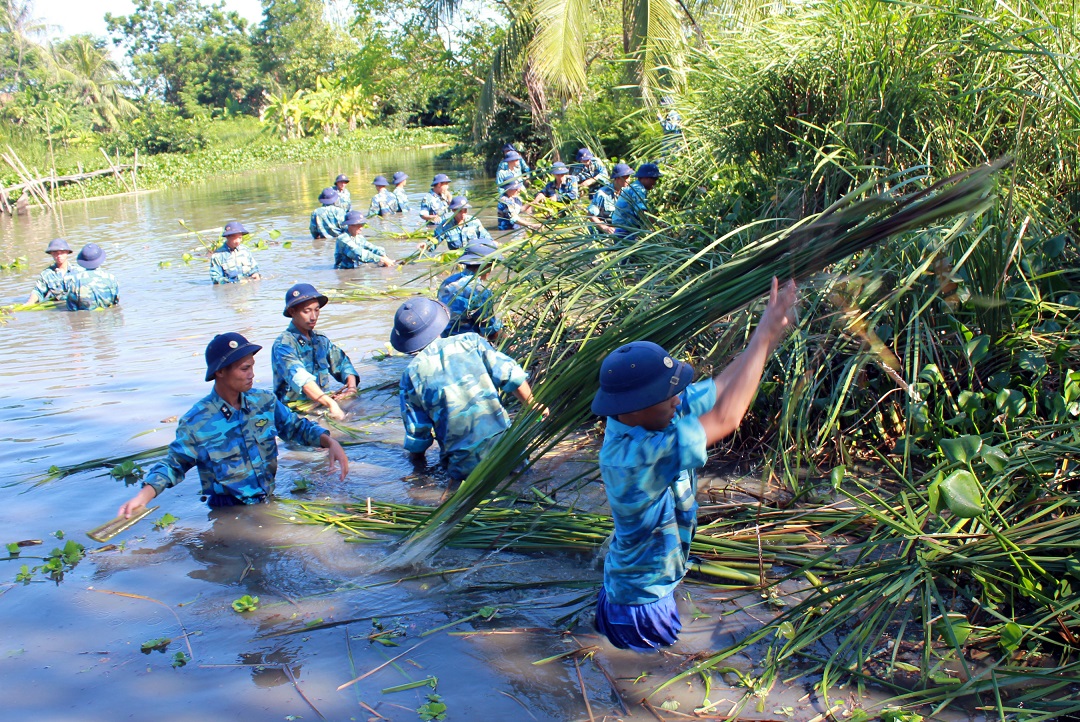 Qua 3 ngày làm việc, cán bộ, chiến sĩ đơn vị và nhân dân địa phương đã nạo vét được hơn 16 km kênh mương nội đồng, vận chuyển đất đá gia cố 2 km đê xung yếu.