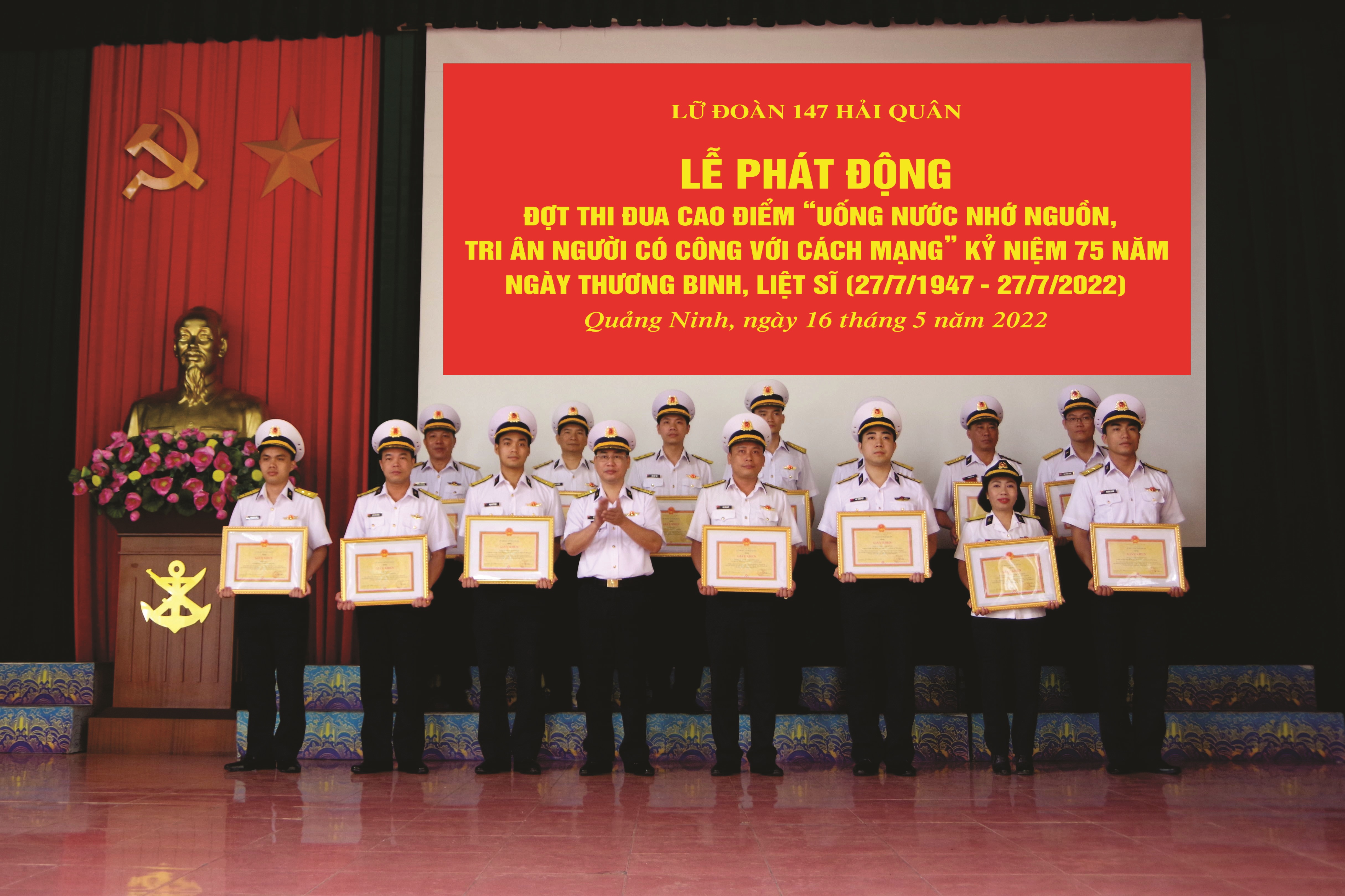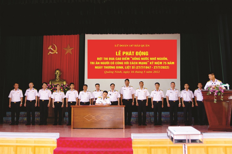 Sáng 16/5, tại Quảng Ninh, Lữ đoàn 147, Vùng 1 Hải quân tổ chức Lễ phát động đợt thi đua cao điểm với chủ đề “Uống nước nhớ nguồn, tri ân người có công với cách mạng” hướng tới kỷ niệm 75 năm Ngày thương binh, liệt sĩ (27/7/1947-27/7/2022). Thượng tá Lê Tuấn Anh, Phó Chính ủy Lữ đoàn chủ trì.
