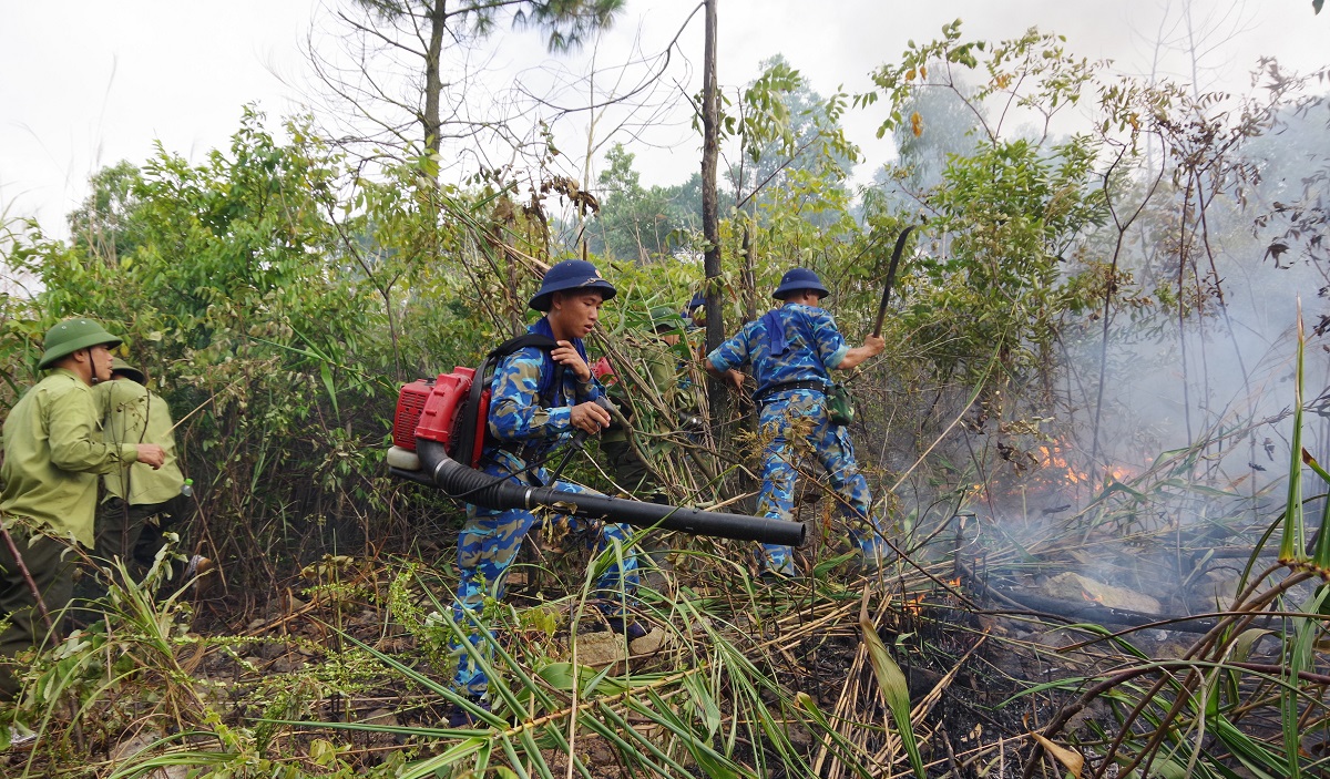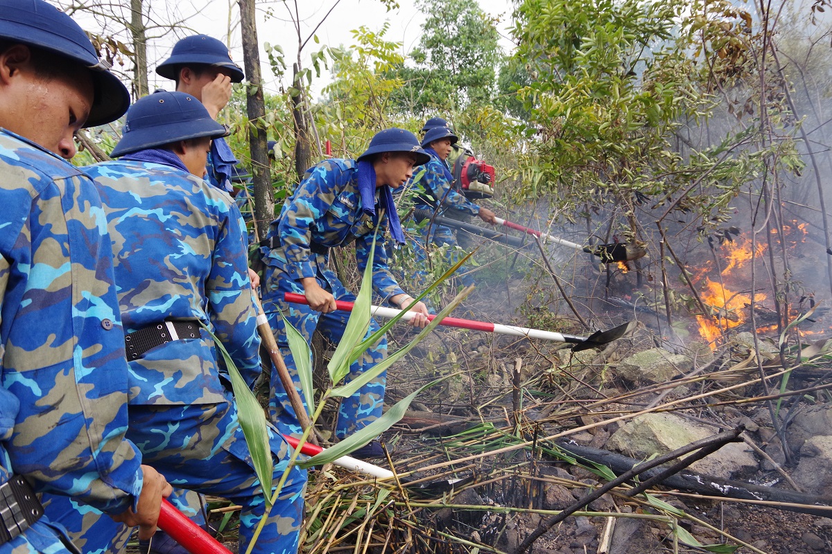 Cán bộ, chiến sĩ Lữ đoàn 147 đã cùng các lực lượng trên địa bàn nhanh chóng sử dụng các phương tiện chữa cháy, phát tuyến ngăn đám cháy lan sang khu vực rừng phòng hộ.