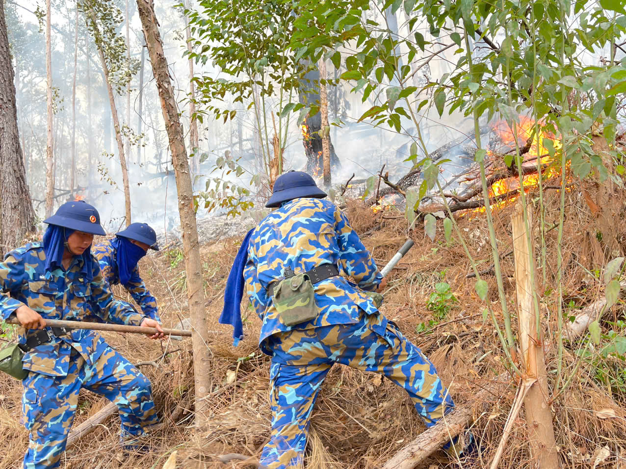 Cán bộ, chiến sĩ Lữ đoàn 147 cùng các lực lượng và nhân dân trên địa bàn nhanh chóng sử dụng các phương tiện chữa cháy, phân tuyến, ngăn không cho đám cháy lan rộng.
