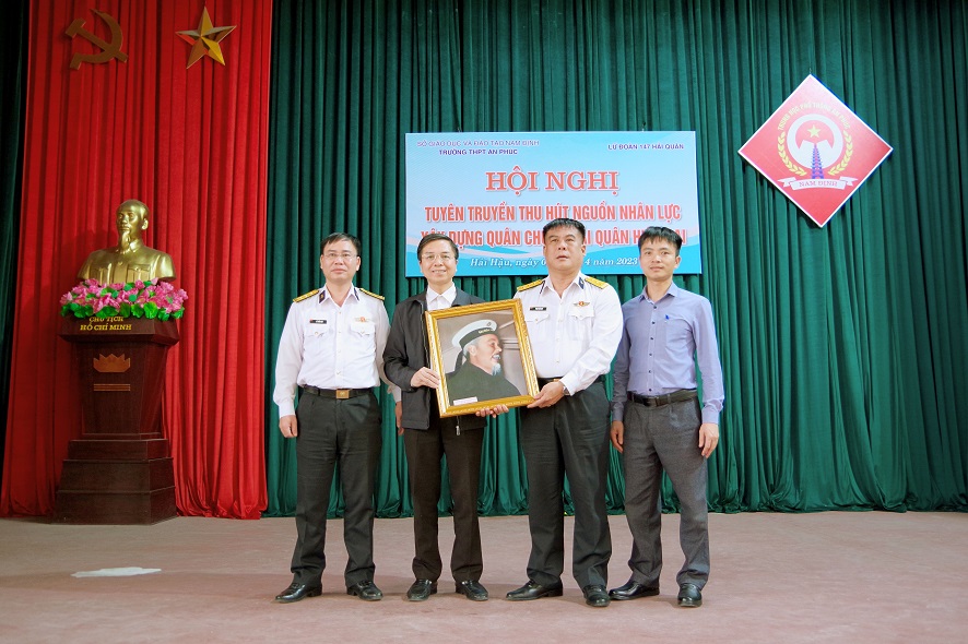 Đại diện Lữ đoàn 147 tặng trường THPT An Phúc ảnh Bác Hồ đội mũ Hải quân