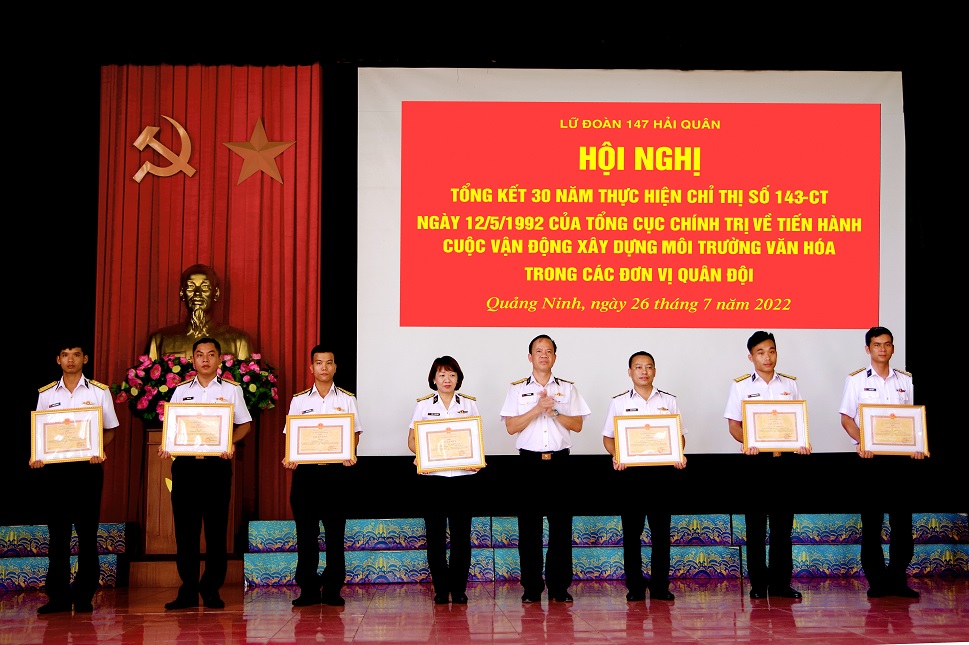 Chiều 26/7, tại Quảng Ninh, Lữ đoàn 147, Vùng 1 Hải quân tổ chức Hội nghị tổng kết 30 năm thực hiện Chỉ thị số 143-CT ngày 12/5/1992 của Tổng cục Chính trị QĐND Việt Nam về tiến hành cuộc vận động xây dựng môi trường văn hóa trong các đơn vị Quân đội. Thượng tá Vũ Tiến Dũng, Bí thư Đảng ủy, Chính ủy Lữ đoàn chủ trì.