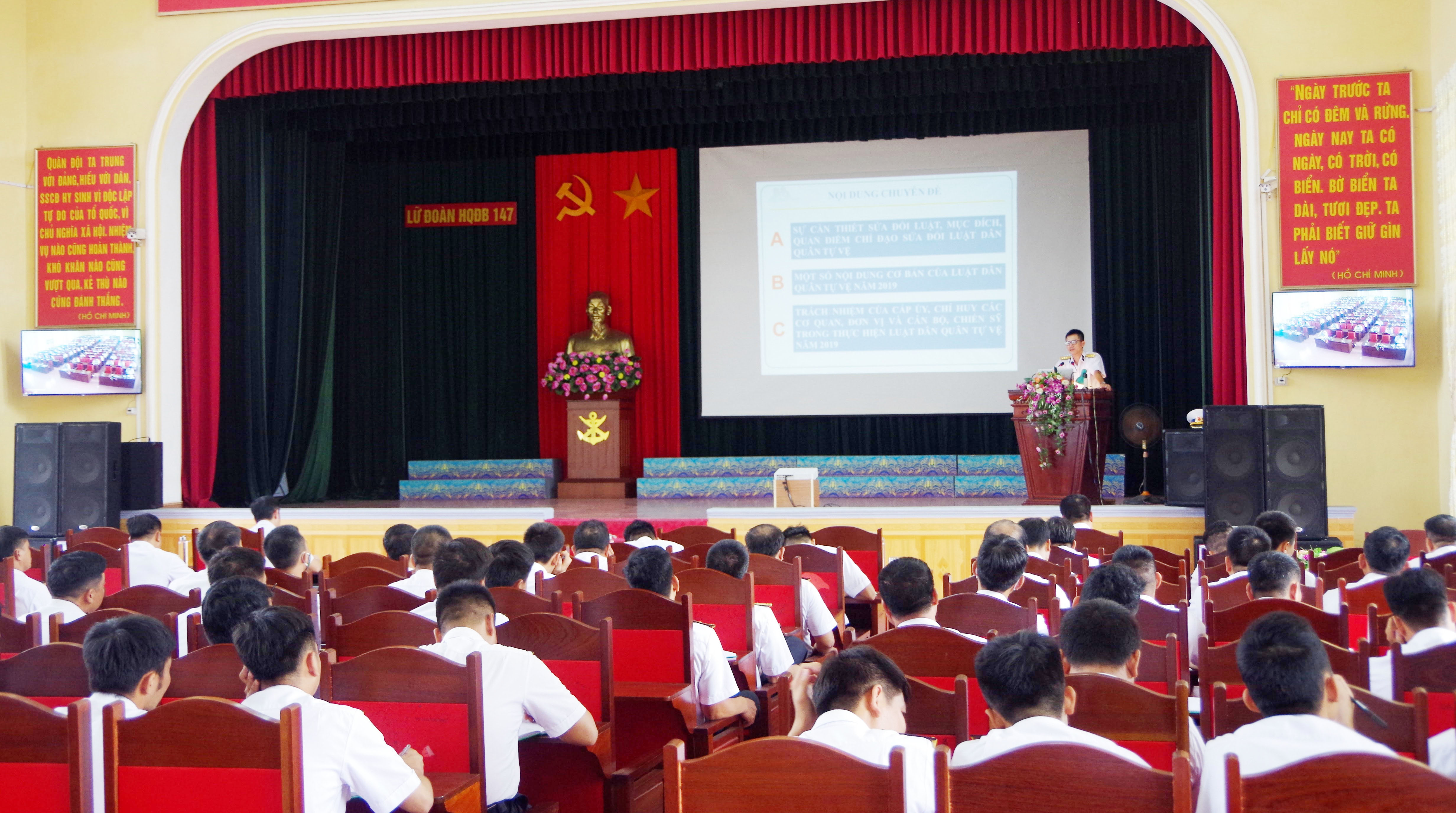 Cán bộ, nhân viên Lữ đoàn 147 được nghe báo cáo viên của các cơ quan pháp luật Quân chủng giới thiệu 7 chuyên đề gồm: Một số nội dung cơ bản của Luật Lực lượng dự bị động viên năm 2019; Luật Phòng, chống tác hại của rượu bia năm 2019; Luật Dân quân tự vệ năm 2019; Tình hình vi phạm, tội phạm và các quy định của Nhà nước, Bộ Quốc phòng về tội phạm, vi phạm pháp luật, kỷ luật; Thực trạng và giải pháp phòng ngừa tự tử, tự sát trong Quân đội; Những điểm mới của Bộ luật Hình sự năm 2015 quy định về các tội xâm phạm nghĩa vụ, trách nhiệm của quân nhân và trách nhiệm của người phối thuộc với Quân đội trong chiến đấu, phục vụ chiến đấu; Nâng cao chất lượng thực hành quyền công tố và kiểm sát điều tra vụ án hình sự đảm bảo quyền con người theo Công ước chống tra tấn của Liên Hợp quốc.