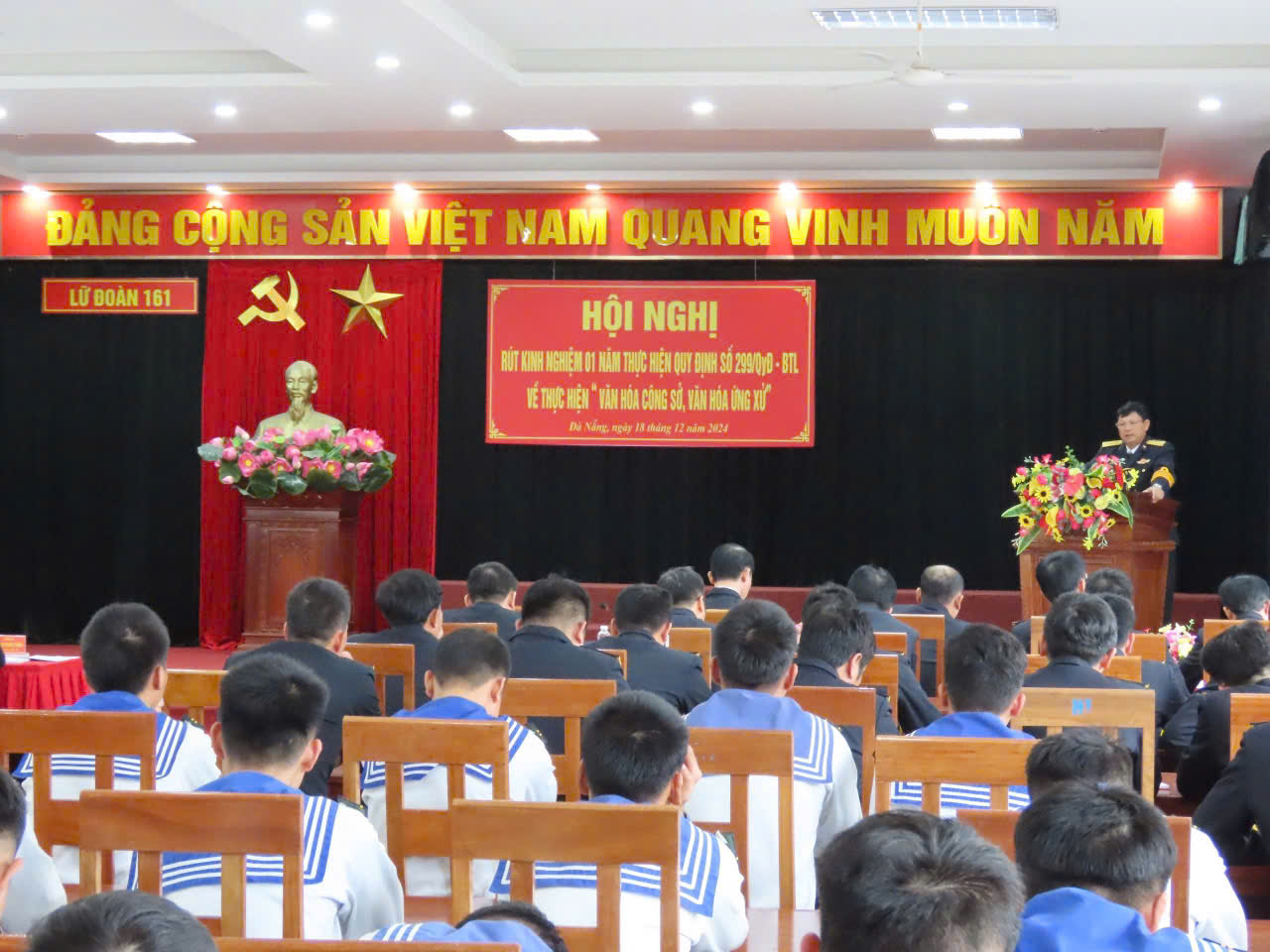 Thời gian qua, Đảng uỷ, chỉ huy Lữ đoàn 161 đã lãnh đạo, quán triệt, triển khai thực hiện nghiêm túc và có hiệu quả Quy định số 299 của Bộ Tư lệnh Vùng 3 về thực hiện “văn hóa công sở, văn hóa ứng xử”, gắn với thực hiện Quy định số 144 về chuẩn mực đạo đức cách mạng của cán bộ, đảng viên trong giai đoạn mới.