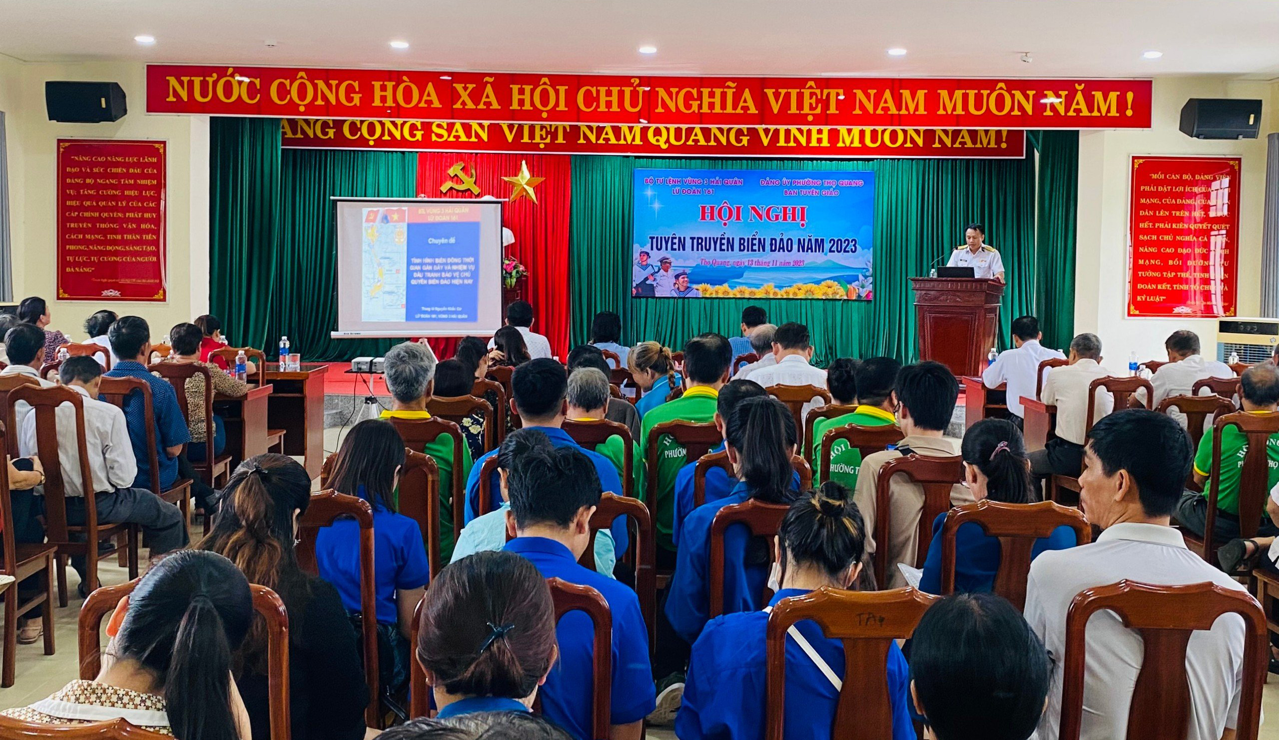 Chiều 13/11, Lữ đoàn 161, Vùng 3 Hải quân phối hợp với UBND phường Thọ Quang, quận Sơn Trà, TP. Đà Nẵng tổ chức Hội nghị thông tin về tình hình biển, đảo và tuyên truyền, phổ biến pháp luật cho gần 200 đại biểu là cán bộ, nhân dân trên địa bàn phường Thọ Quang.