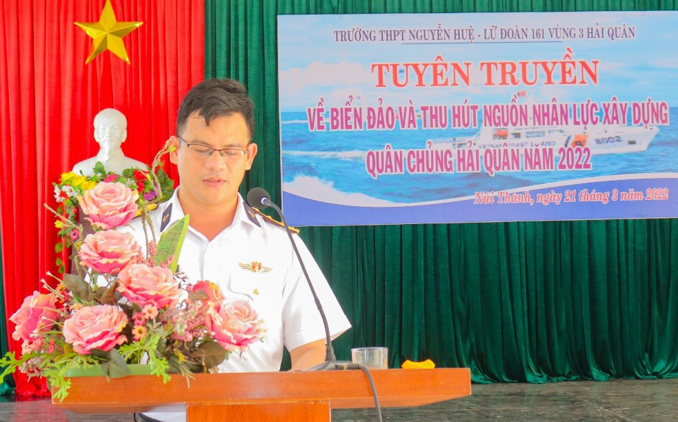 Báo cáo viên của Lữ đoàn thông tin về tình hình biển, đảo tại Trường THTP Nguyễn Huệ, huyện Núi Thành, tỉnh Quảng Nam