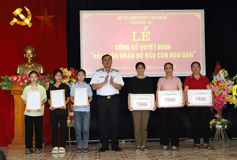 Ngày 4/8, tại Quảng Bình, Lữ đoàn 161, Vùng 3 Hải quân tổ chức Lễ công bố, trao quyết định “Hải quân nhận đỡ đầu con ngư dân” cho con ngư dân có hoàn cảnh đặc biệt khó khăn ở xã Quảng Minh, thị xã Ba Đồn, tỉnh Quảng Bình.