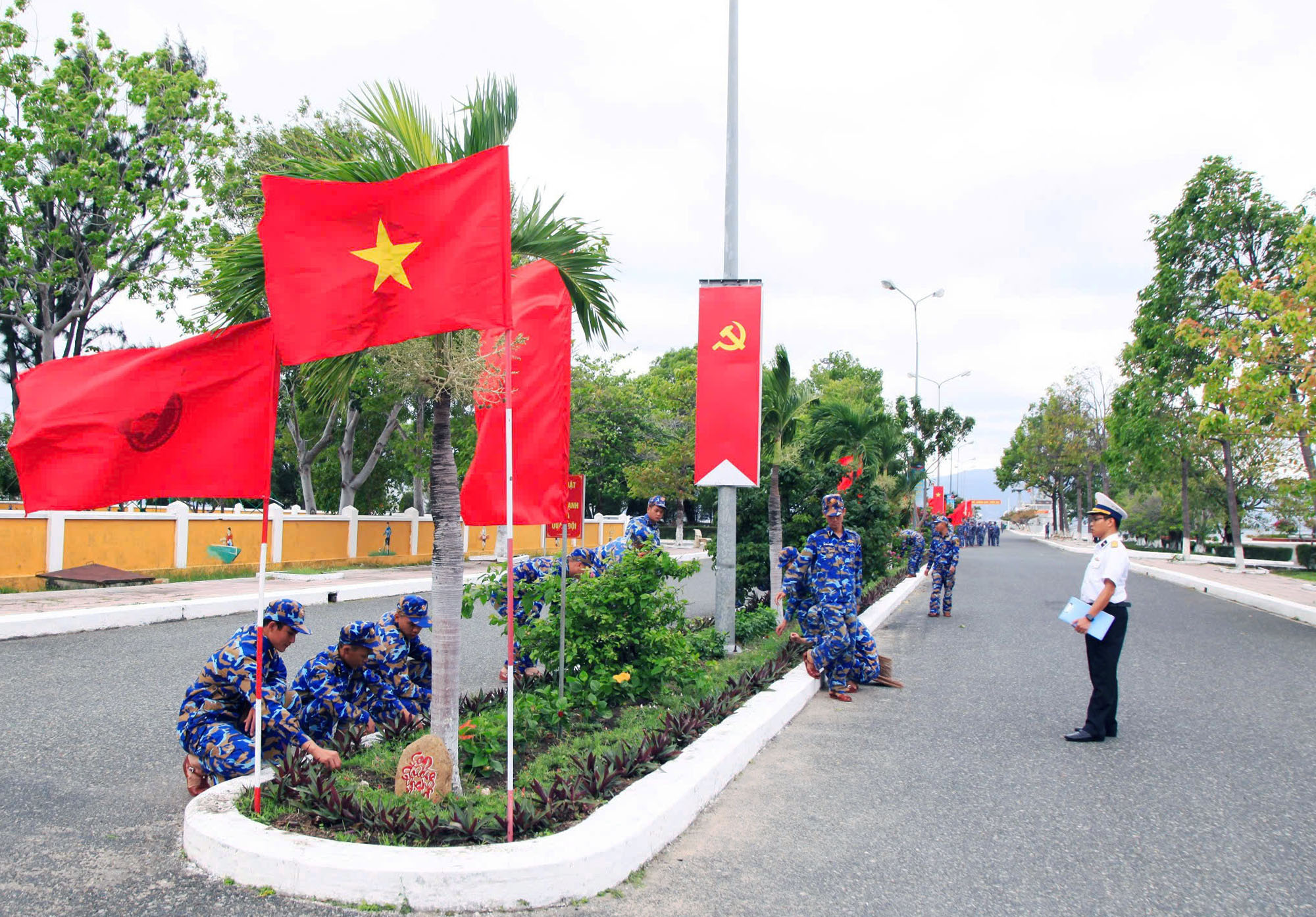 Đến thăm Lữ đoàn 162 hôm nay, từ khuôn viên doanh trại đến các trục đường trên Quân cảng Cam Ranh bừng sáng lộng lẫy hơn khi được trang hoàng rợp cờ, hoa, băng rôn, khẩu hiệu… chào mừng Đại hội Đảng bộ Vùng 4.