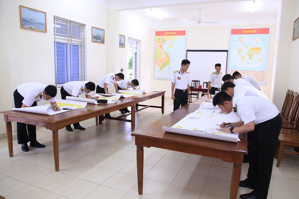 Học viên đào tạo thuyền trưởng tàu cấp 3 thực hành tác nghiệp tổng hợp trên hải đồ và lưới vận động.