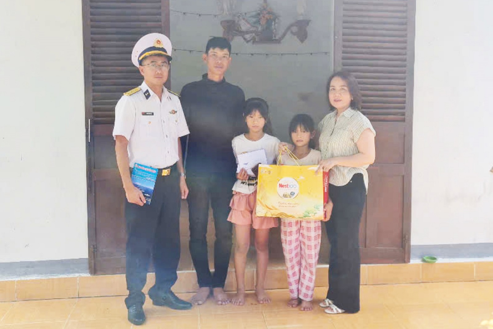 Tại gia đình cháu Mang Võ Khánh Băng (10 tuổi), con ngư dân Võ Xuân Đông và gia đình cháu Hoàng Trí Bảo (11 tuổi), con ngư dân Hoàng Trọng Nghĩa, đoàn công tác đơn vị đã ân cần thăm hỏi sức khoẻ, cuộc sống của gia đình và kết quả học tập của các cháu. Đồng thời động viên, mong muốn các cháu cố gắng, chăm ngoan, học tập tốt để trở thành những công dân có ích, cống hiến xây dựng quê hương và gia đình trong tương lai.