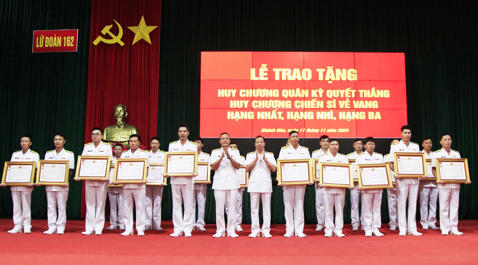 Chiều 11/11, tại TP. Cam Ranh, tỉnh Khánh Hoà, Lữ đoàn 162, Vùng 4 Hải quân tổ chức Lễ trao tặng Huy chương Quân kỳ quyết thắng, Huy chương Chiến sĩ vẻ vang hạng Nhất, Nhì, Ba cho các đồng chí sĩ quan, QNCN đang công tác tại Lữ đoàn. Thượng tá Vũ Viết Bằng, Phó Chính ủy Lữ đoàn chủ trì.