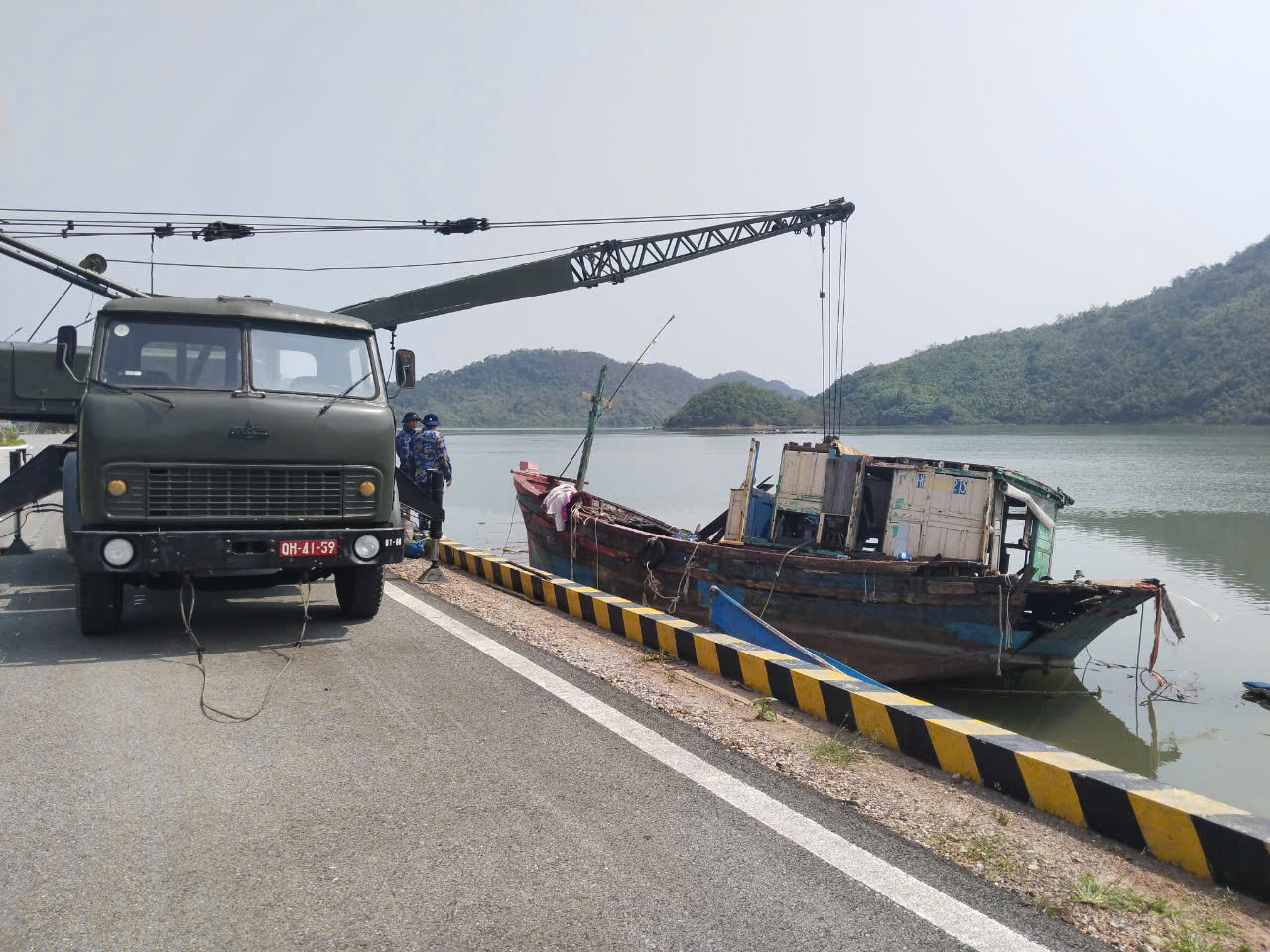 Với tinh thần khẩn trương, hết mình vì nhân dân, cán bộ, chiến sĩ Lữ đoàn 169 đã sử dụng xe cẩu trục vớt thành công tàu cá HP90292TS.