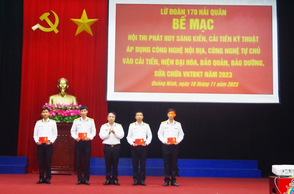 Chiều 16/11, tại Quảng Ninh, Lữ đoàn 170, Vùng 1 Hải quân tổ chức bế mạc Hội thi phát huy sáng kiến, cải tiến kỹ thuật, áp dụng công nghệ nội địa, công nghệ tự chủ vào cải tiến, hiện đại hoá, bảo quản, bảo dưỡng, sửa chữa VKTBKT năm 2023. Đại tá Nguyễn Việt Trung, Phó Chủ nhiệm Hậu cần-Kỹ thuật Vùng 1 dự và chỉ đạo.