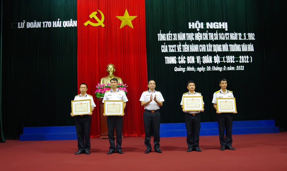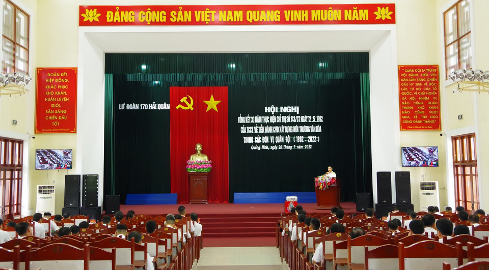 Chiều 20/7, tại Quảng Ninh, Lữ đoàn 170, Vùng 1 Hải quân tổ chức Hội nghị tổng kết 30 năm thực hiện Chỉ thị số 143/CT ngày 12/5/1992 của Tổng cục Chính trị về tiến hành cuộc vận động xây dựng môi trường văn hóa trong các đơn vị quân đội.