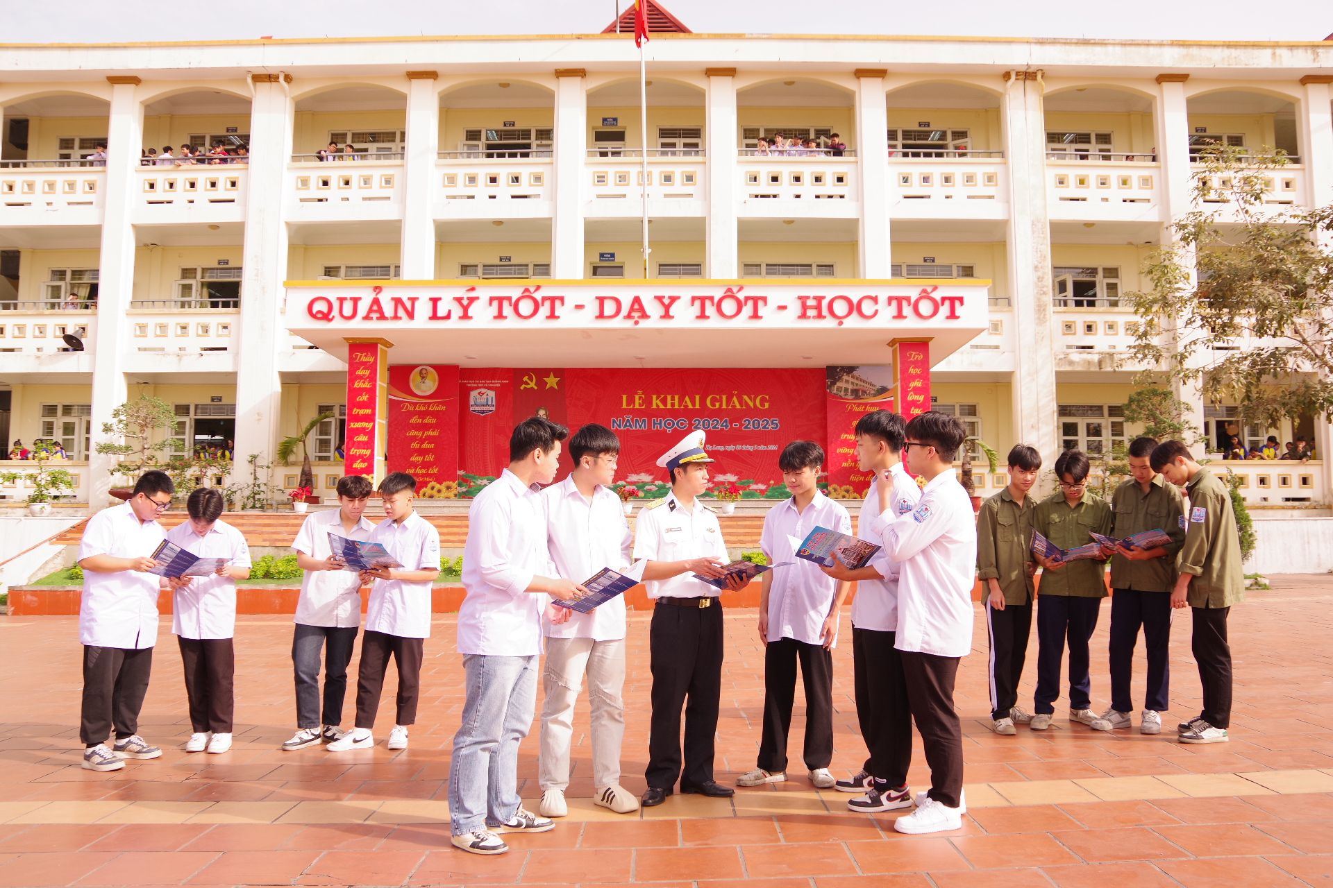 Cán bộ Lữ đoàn 170 trao đổi, tư vấn cho các em học sinh trường THPT Vũ Văn Hiếu, TP. Hạ Long về tuyển sinh vào Học viện Hải quân