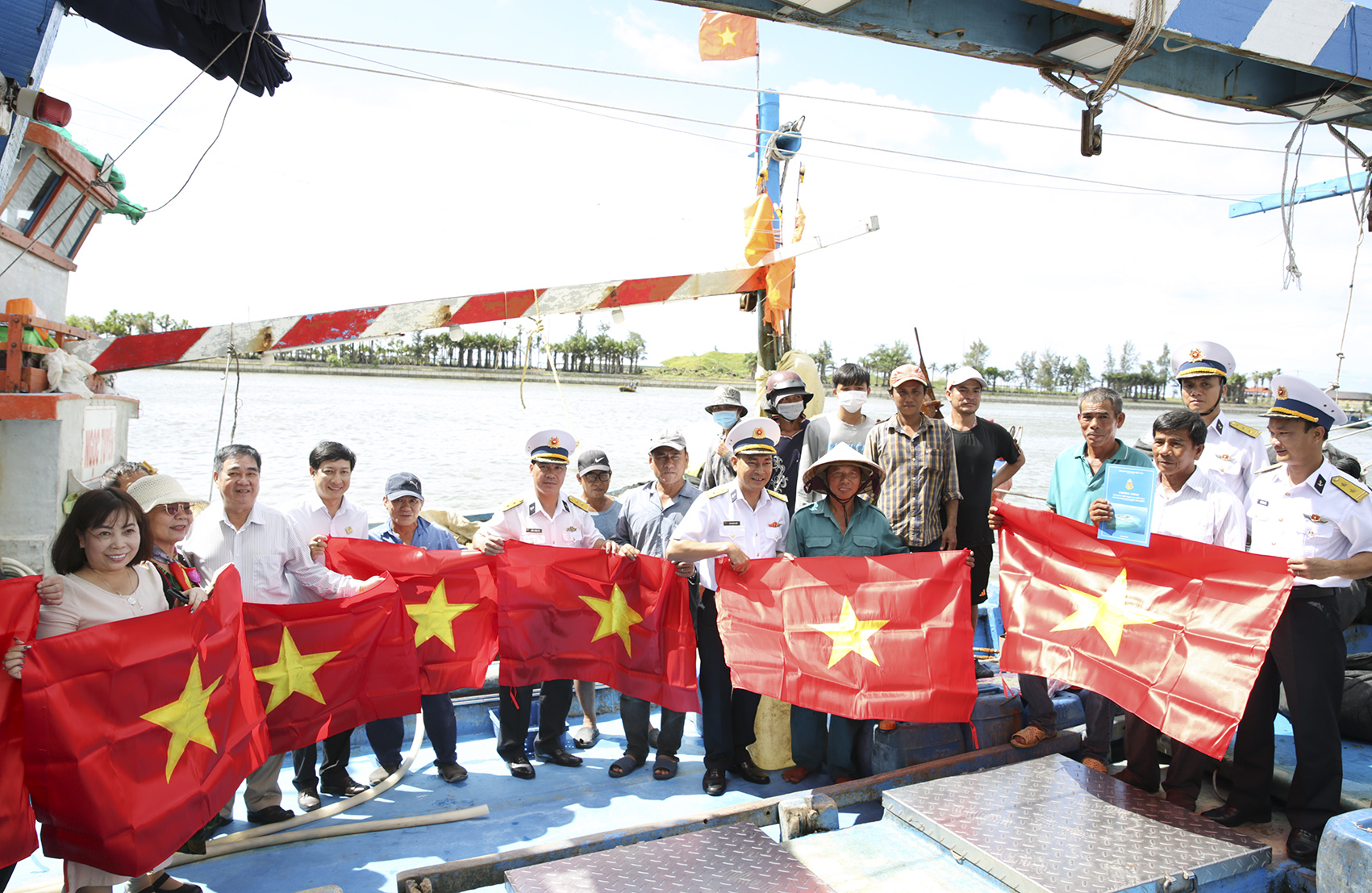 Tặng cờ Tổ quốc và áo phao cho các ngư dân tại cảng cá Lộc An