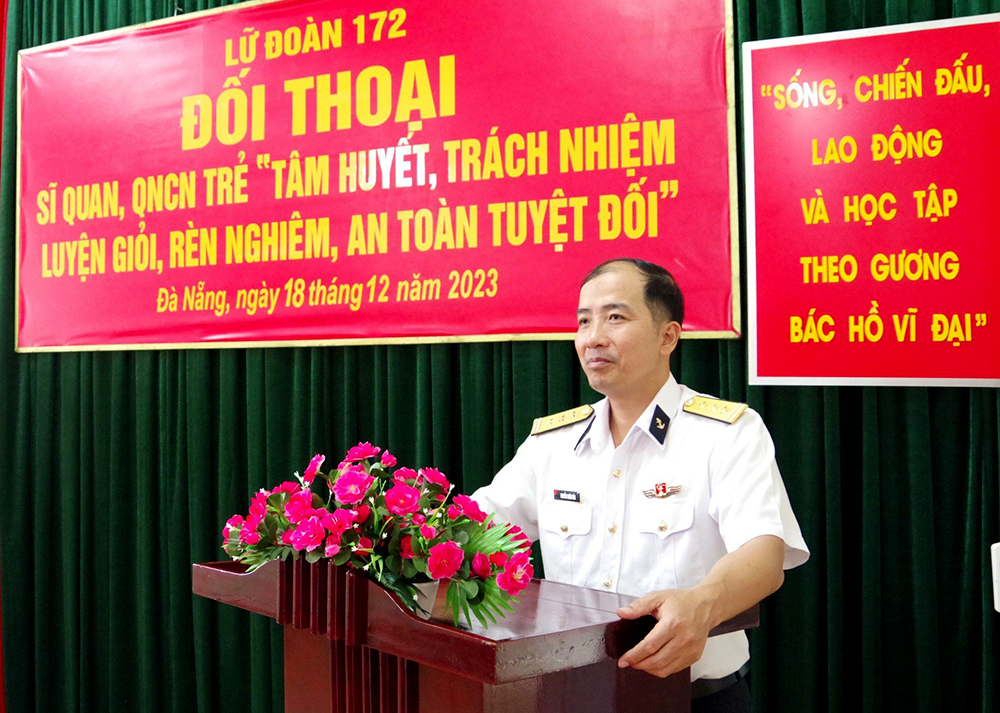 Ngày 18/12, tại Đà Nẵng, Lữ đoàn 172, Vùng 3 Hải quân tổ chức buổi đối thoại sĩ quan, quân nhân chuyên nghiệp trẻ với chủ đề “Tâm huyết, trách nhiệm, luyện giỏi, rèn nghiêm, an toàn tuyệt đối”.
