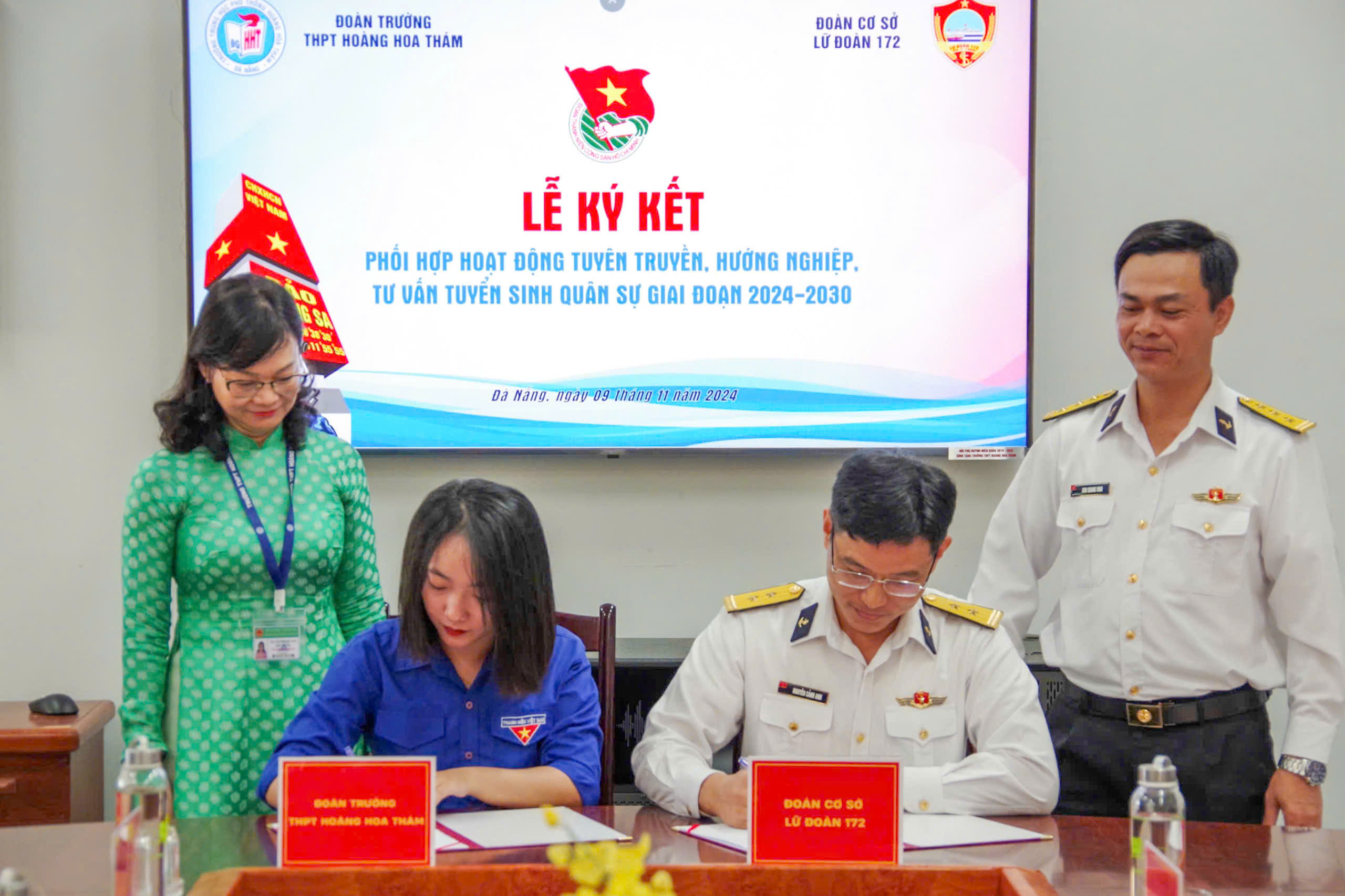Sáng 9/11, tại TP. Đà Nẵng, Đoàn cơ sở Lữ đoàn 172, Vùng 3 Hải quân và Đoàn Trường THPT Hoàng Hoa Thám tổ chức ký kết Chương trình phối hợp thực hiện công tác tuyên truyền, hướng nghiệp tư vấn tuyển sinh quân sự cho thanh, thiếu niên giai đoạn 2024-2030 và thông tin về tình hình biển, đảo.