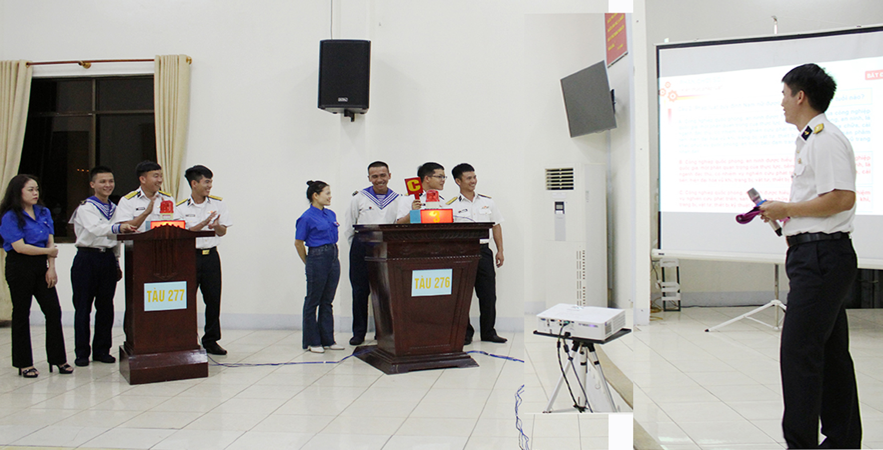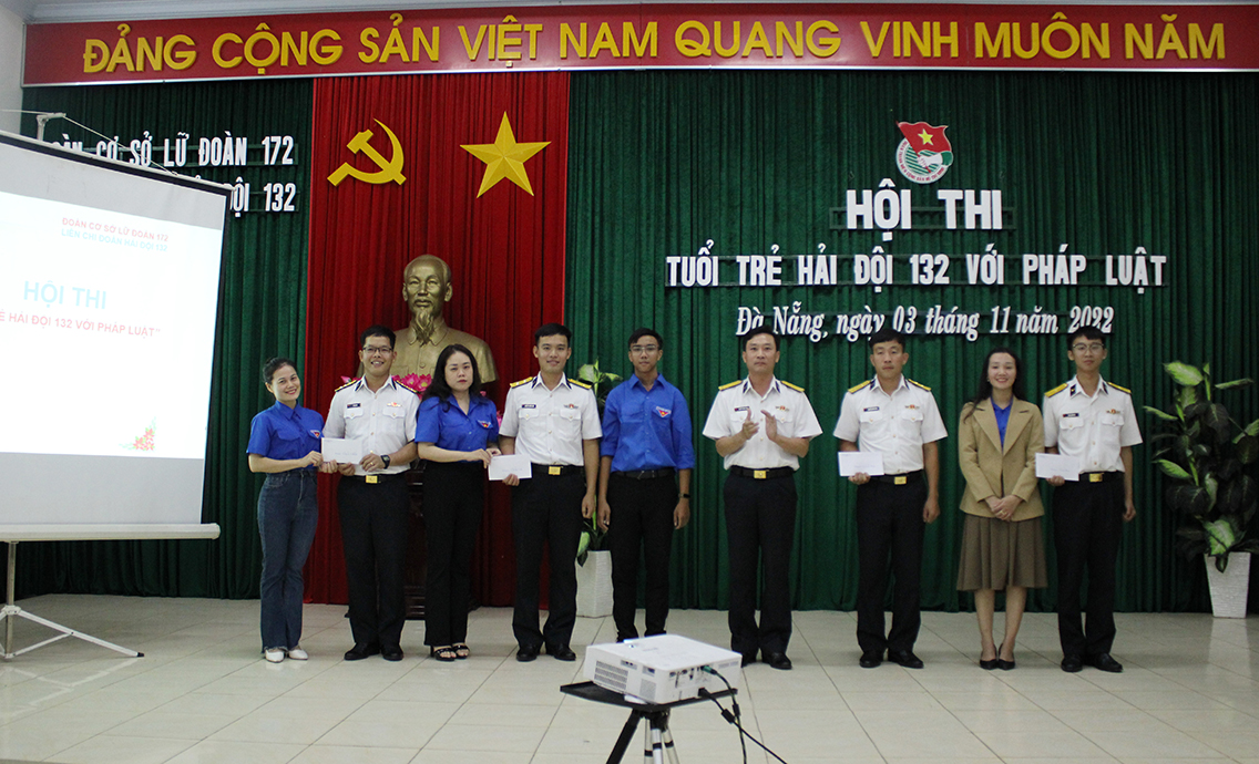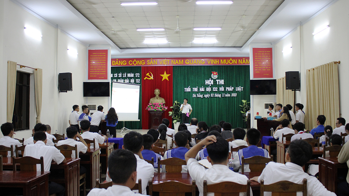 Chúng tôi tham dự Hội thi tuổi trẻ Hải đội 132, Lữ đoàn 172 với pháp luật vào những ngày đầu tháng 11. Hội trường của Lữ đoàn hôm nay chật kín người. Tiếng vỗ tay, tiếng reo hò cổ vũ như nhiều hơn khi có sự tham gia của các thầy, cô giáo, các đoàn viên thanh niên Trường THCS Phan Bội Châu, phường Phước Mỹ, quận Sơn Trà, TP. Đà Nẵng-đơn vị kết nghĩa với Hải đội. Tham gia hội thi có 4 đội là chi đoàn các tàu 274, 275, 276, 277. Mỗi đội được tăng cường thêm một đoàn viên thanh niên đến từ đơn vị kết nghĩa. Các đội thi tranh tài ở 3 nội dung được thiết kế theo dạng một số “Game show” truyền hình gồm: Kiến thức pháp luật; trả lời nhanh và về đích.