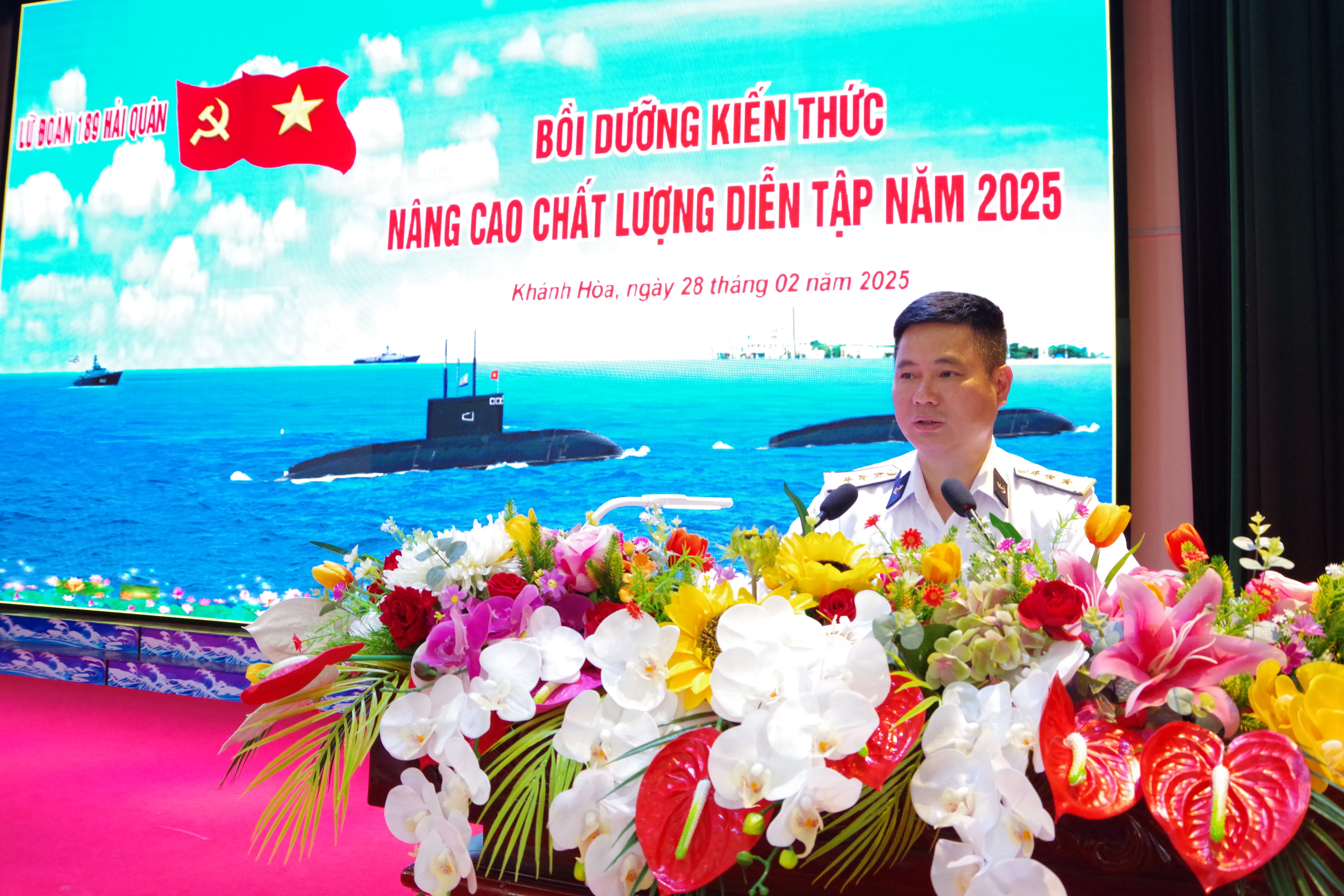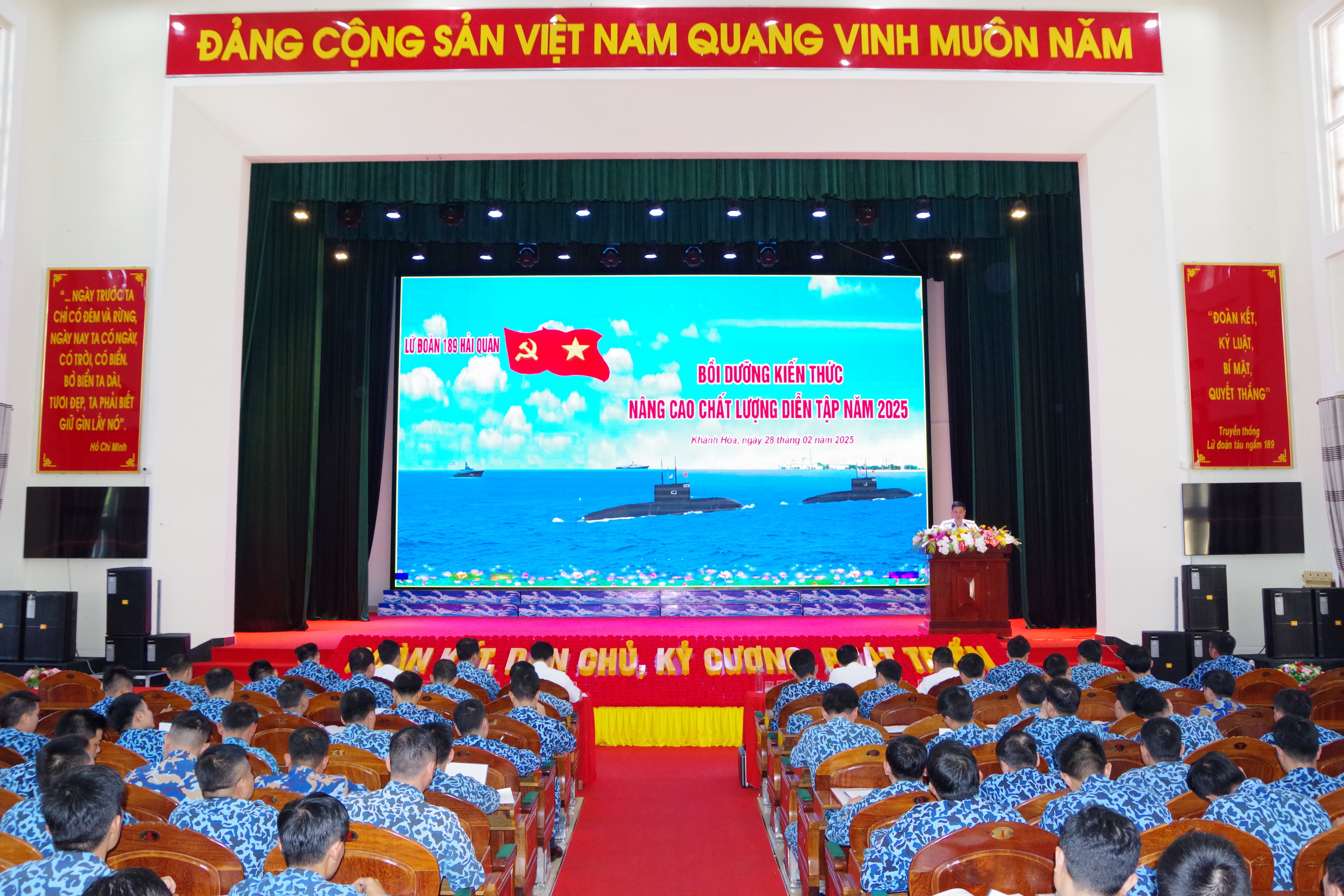 Sáng 28/2, tại TP. Cam Ranh, tỉnh Khánh Hòa, Lữ đoàn 189 Hải quân tổ chức bồi dưỡng kiến thức nâng cao chất lượng diễn tập năm 2025. Thượng tá Nguyễn Xuân Quân, Lữ đoàn trưởng truyền đạt các nội dunng.