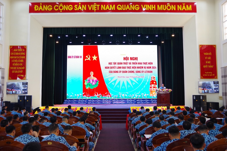 Sáng 11/1, tại TP. Cam Ranh, tỉnh Khánh Hòa, Lữ đoàn 189 Hải quân tổ chức hội nghị học tập, quán triệt và triển khai nghị quyết lãnh đạo thực hiện nhiệm vụ năm 2024 của Đảng ủy Quân chủng, Đảng ủy Lữ đoàn. Thượng tá Nguyễn Đức Tường, Bí thư Đảng ủy, Chính ủy Lữ đoàn chủ trì.