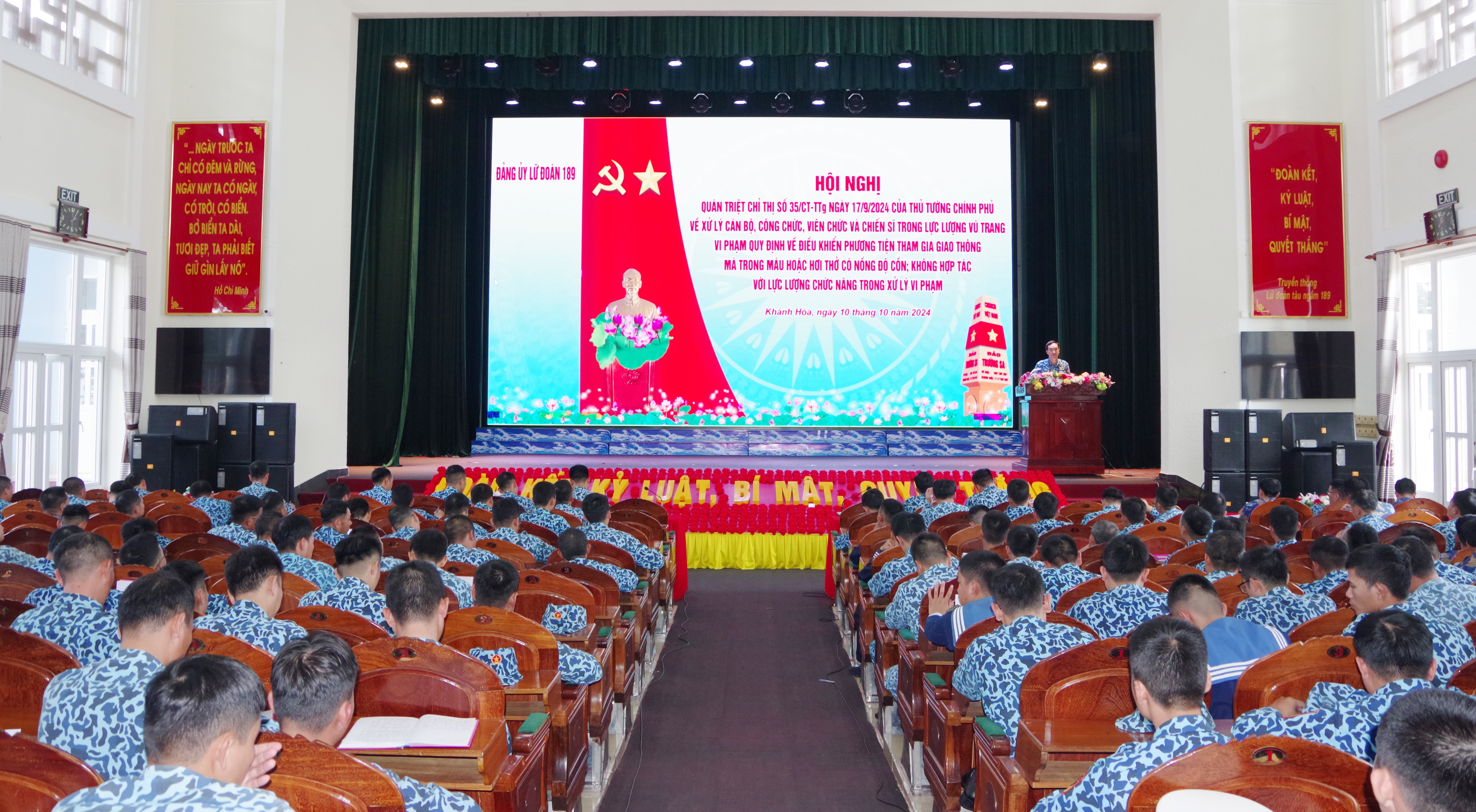 Chiều 10/10, tại TP. Cam Ranh, tỉnh Khánh Hòa, Lữ đoàn 189 Hải quân tổ chức Hội nghị quán triệt Chỉ thị số 35/CT-TTg ngày 17/9/2024 của Thủ tướng Chính phủ về xử lý cán bộ, công chức, viên chức và chiến sĩ trong lực lượng vũ trang vi phạm quy định về điều khiển phương tiện giao thông mà trong máu hoặc hơi thở có nồng độ cồn; không hợp tác với lực lượng chức năng trong xử lý vi phạm (Chỉ thị số 35).