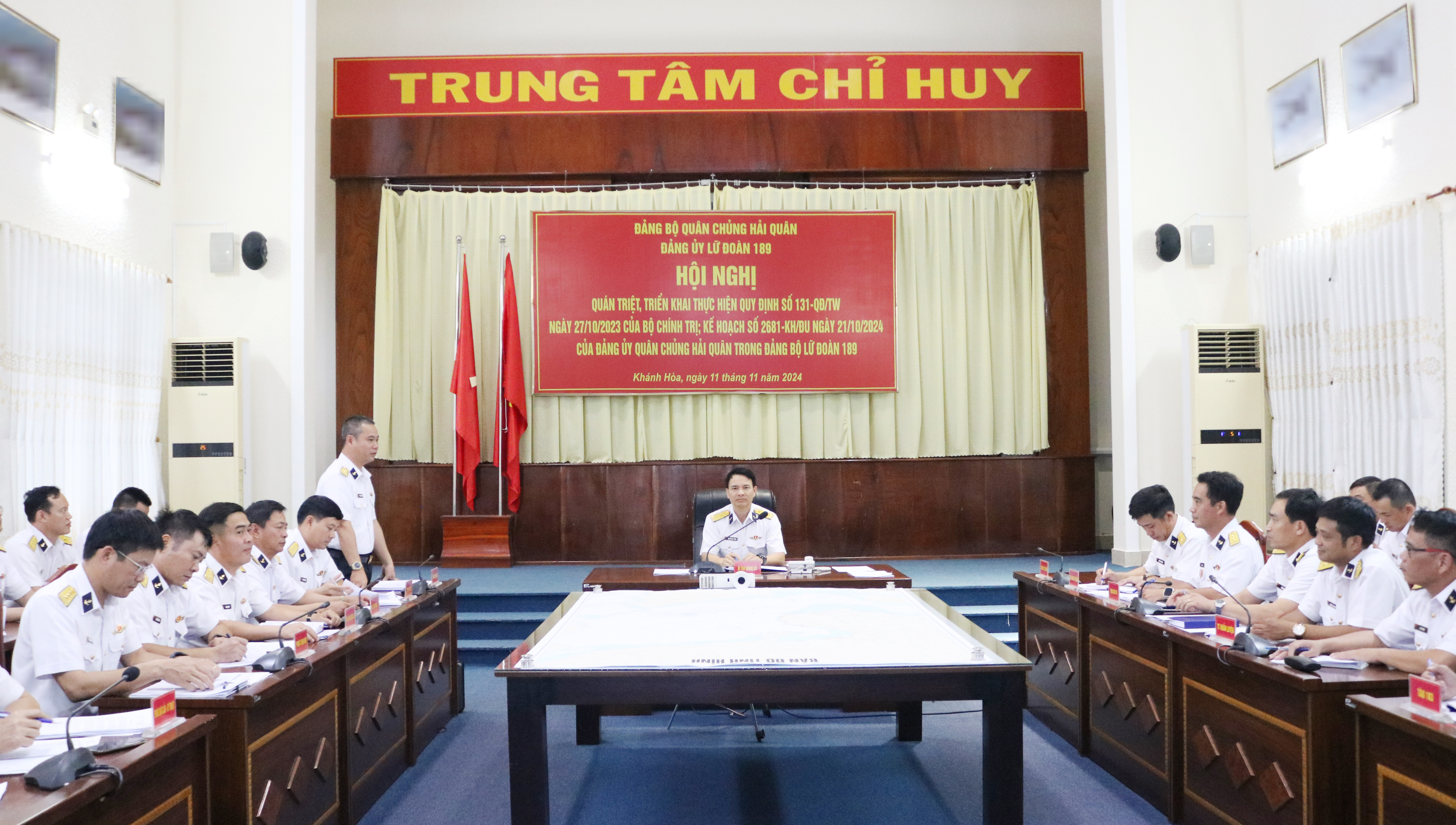 Ngày 11/11, tại TP. Cam Ranh, tỉnh Khánh Hòa, Lữ đoàn 189 Hải quân tổ chức Hội nghị quán triệt, triển khai thực hiện Quy định số 131-QĐ/TW ngày 27/10/2024 của Bộ Chính trị; Kế hoạch số 2681-KH/ĐU ngày 21/10/2024 của Đảng uỷ Quân chủng Hải quân trong Đảng bộ Lữ đoàn. Thượng tá Nguyễn Đức Tường, Bí thư Đảng uỷ, Chính uỷ Lữ đoàn chủ trì.
