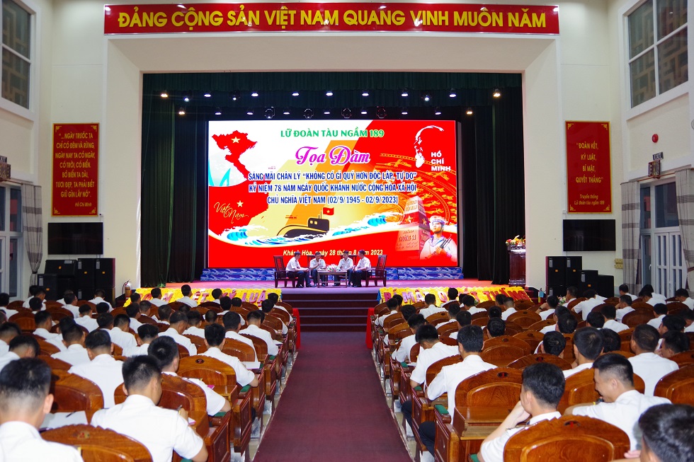 Tối 28/8, tại TP. Cam Ranh, tỉnh Khánh Hòa, Lữ đoàn 189 Hải quân tổ chức tọa đàm nhân kỷ niệm 78 năm Ngày Quốc khánh nước Cộng hòa xã hội chủ nghĩa Việt Nam với chủ đề: Sáng mãi chân lý “không có gì quý hơn độc lập, tự do”.