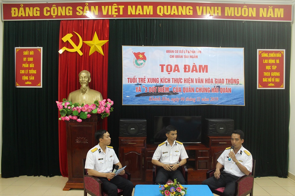 Ngày 6-11, Chi đoàn tàu ngầm thuộc Đoàn cơ sở Lữ đoàn 189 đã tổ chức Tọa đàm thanh niên với chủ đề “Tuổi trẻ xung kích thực hiện văn hóa giao thông và 3 dứt điểm của Quân chủng Hải quân”.