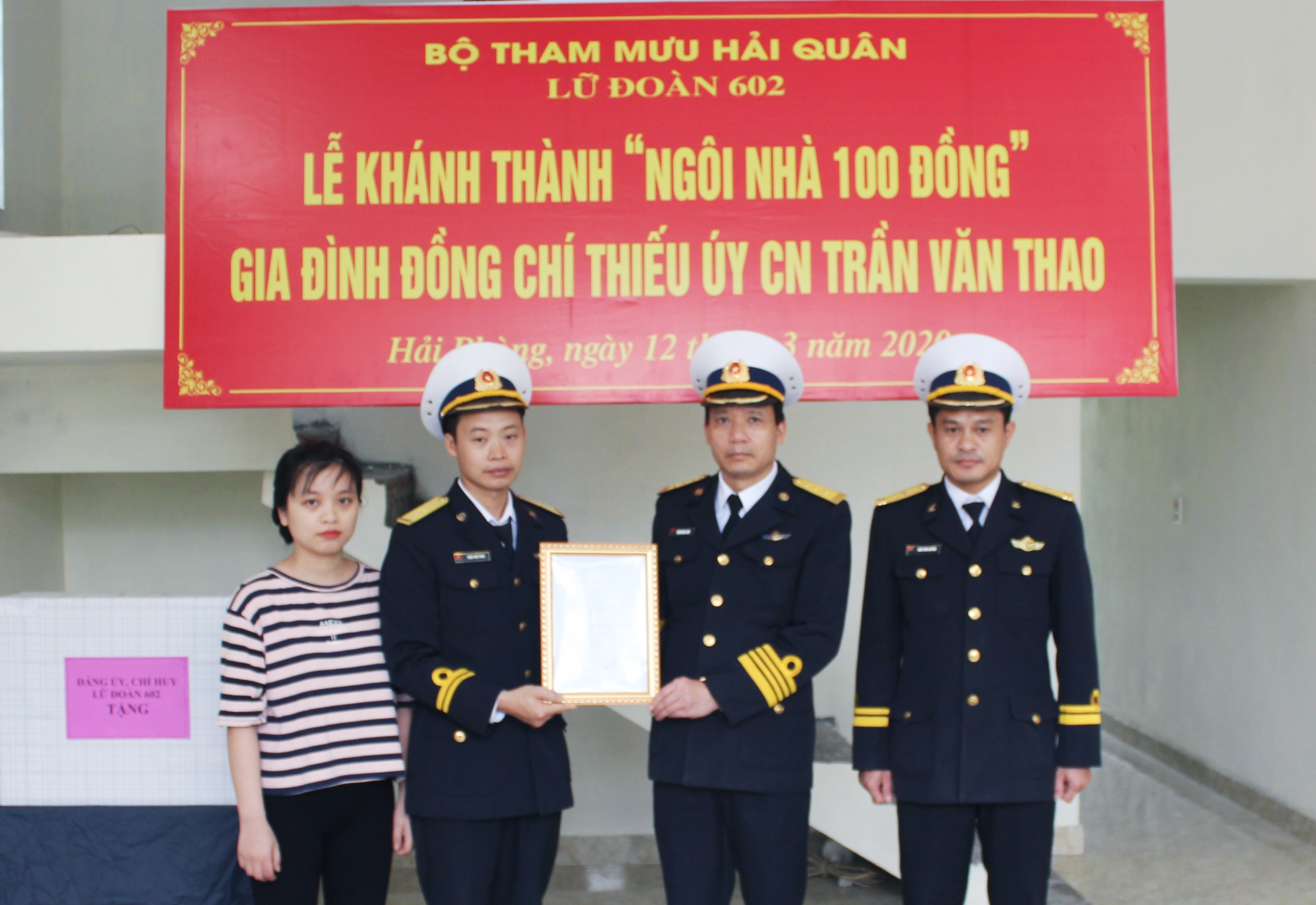 Ngày 12-3, Lữ đoàn 602, Bộ Tham mưu Hải quân tổ chức Lễ bàn giao “Ngôi nhà 100 đồng” tặng gia đình Thiếu úy QNCN Trần Văn Thao. Đồng chí Thao là đoàn viên thuộc Chi đoàn Chính trị-Hậu cần-Kỹ thuật thuộc Đoàn cơ sở Lữ đoàn 602.