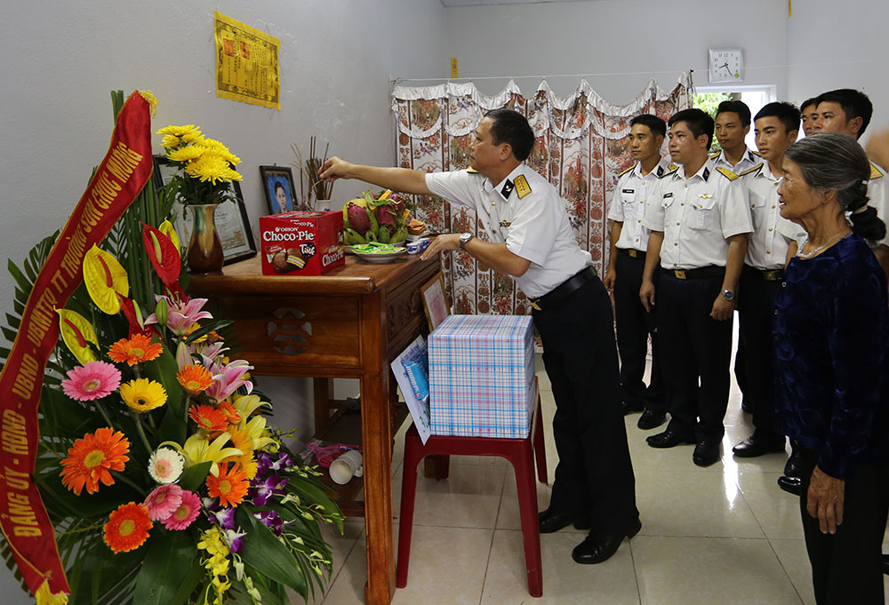 Đại tá Phạm Văn Quý, Chính ủy Lữ đoàn 679 tặng quà cho bà Nguyễn Thị Thêm