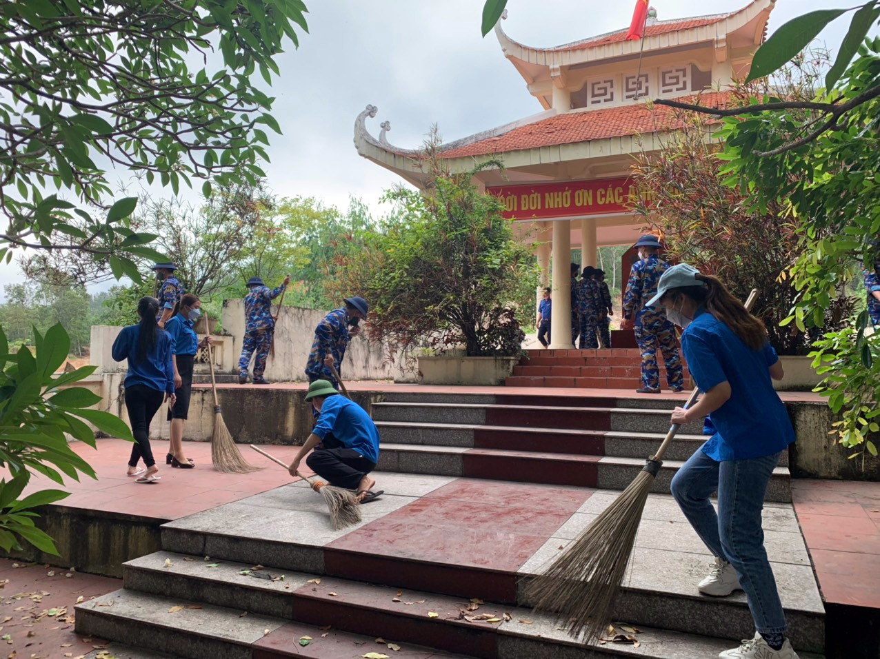Bộ đội cùng đoàn viên thanh niên địa phương lao động làm đẹp nghĩa trang liệt sĩ