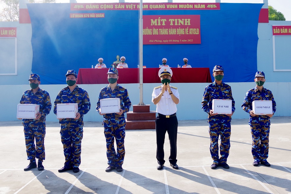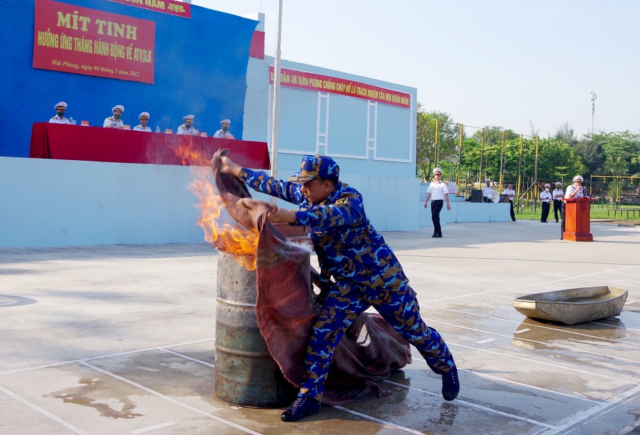 Sáng 4/5, tại Hải Phòng, Lữ đoàn 679, Vùng 1 Hải quân tổ chức mít tinh hưởng ứng Tháng hành động về an toàn, vệ sinh lao động năm 2022 và Hội thao phòng cháy, chữa cháy (PCCC).