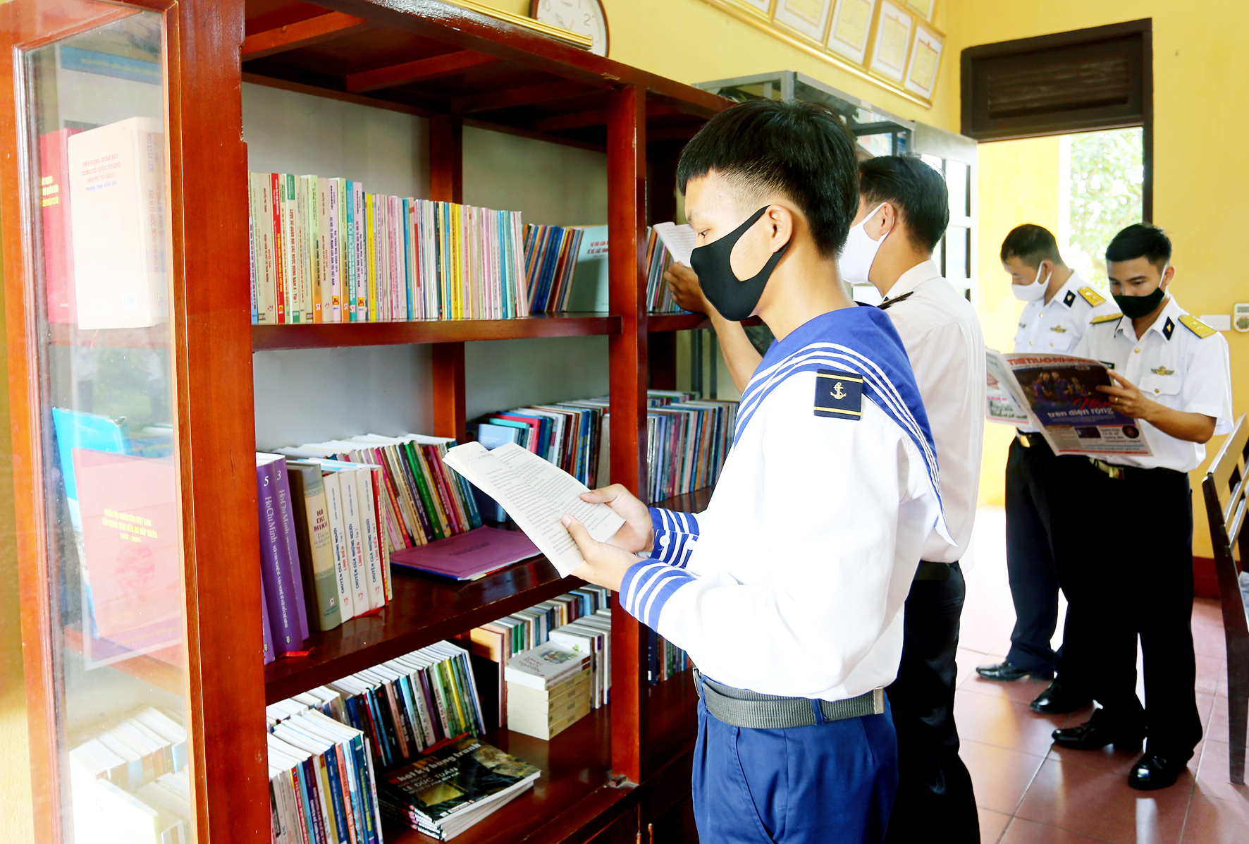 Cán bộ, chiến sĩ Trạm Kỹ thuật thường xuyên cập nhật kiến thức từ tủ sách pháp luật của đơn vị