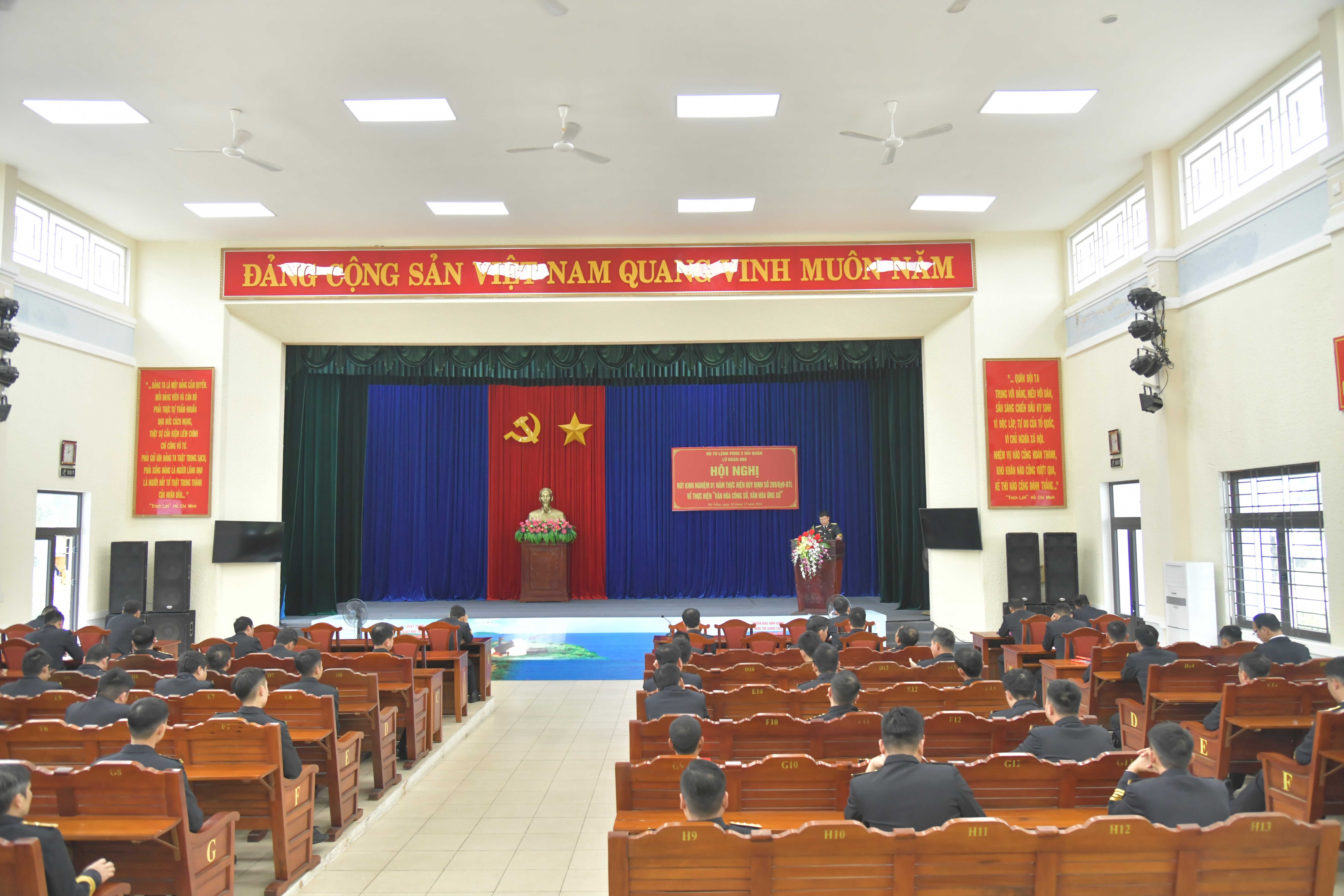 Chiều 26/12, tại Đà Nẵng, Lữ đoàn 680, Vùng 3 Hải quân tổ chức Hội nghị rút kinh nghiệm 1 năm thực hiện Quy định 299 của Bộ Tư lệnh Vùng về “văn hóa công sở, văn hóa ứng xử”. Thượng tá Nguyễn Thanh Minh, Phó Chính ủy Lữ đoàn chủ trì.