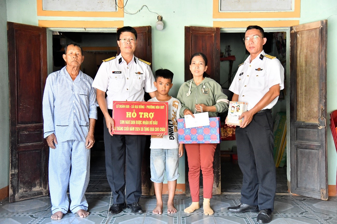 Dịp này, đoàn công tác đã đến thăm, động viên, trao quà và bàn giao kinh phí hỗ trợ 6 tháng cuối năm 2024 của Lữ đoàn và đơn vị kết nghĩa tặng cháu Nguyễn Thành Long tại xã Bình Châu, huyện Bình Sơn, tỉnh Quảng Ngãi.