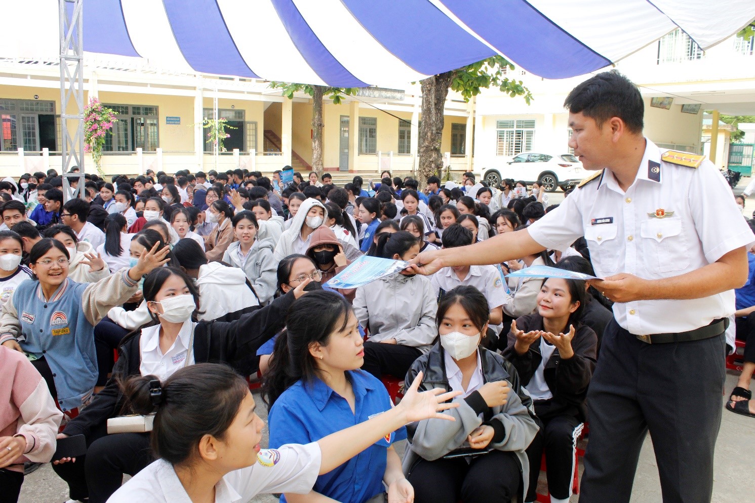 Phát tài liệu tuyên truyền cho học sinh trường THPT Huỳnh Thúc Kháng, TP. Quảng Ngãi