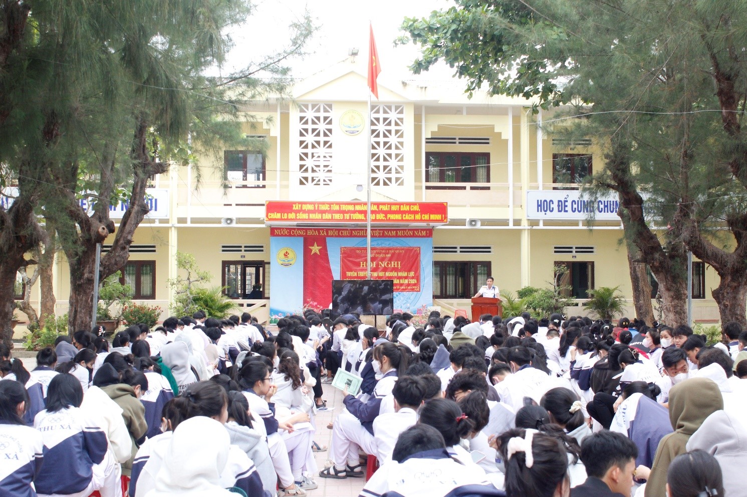 Báo cáo viên của Lữ đoàn đã thông tin đến học sinh những nội dung cơ bản về vị trí, tầm quan trọng của biển, đảo Việt Nam; vai trò của Hải quân Nhân dân Việt Nam trong quản lý, bảo vệ chủ quyền, biển, đảo, thềm lục địa của Tổ quốc; quan điểm, chủ trương của Đảng, Nhà nước ta trong giải quyết các vấn đề tranh chấp trên biển; con đường để được cống hiến, phát triển tài năng của thế hệ trẻ trong Quân chủng Hải quân; hướng dẫn các thủ tục đăng ký dự thi vào Học viện Hải quân năm 2024; các chuyên ngành đào tạo, quyền lợi, nghĩa vụ, các chế độ, chính sách đối với học viên đào tạo sĩ quan tại Học viện Hải quân.