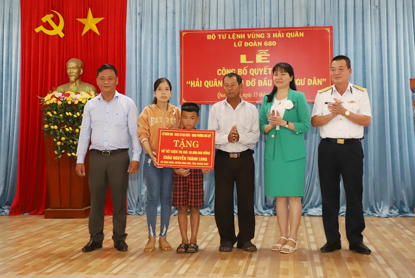 Ngày 15/7, tại tỉnh Quảng Ngãi, Lữ đoàn 680, Vùng 3 Hải quân tổ chức trao quyết định “Hải quân nhận đỡ đầu con ngư dân” có hoàn cảnh đặc biệt khó khăn ở xã Bình Châu, huyện Bình Sơn và trao quyết định hỗ trợ xây dựng “Nhà đại đoàn kết” tại xã Hành Dũng, huyện Nghĩa Hành.