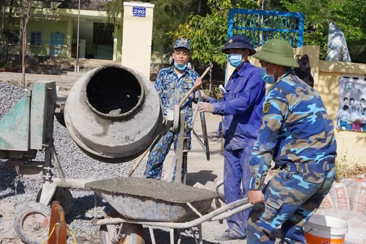 Cán bộ, đoàn viên Lữ đoàn 681 lao động đổ bê tông hành lang cổng trường