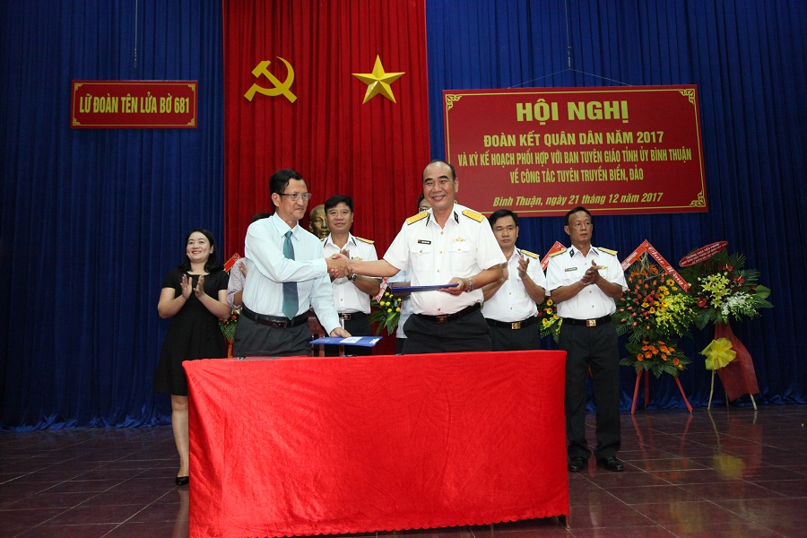Ngày 21-12, tại Bình Thuận, Lữ đoàn 681, Vùng 2 Hải quân tổ chức Hội nghị đoàn kết quân dân năm 2017 và ký kết chương trình phối hợp hoạt động với Ban Tuyên giáo Tỉnh ủy Bình Thuận về công tác tuyên truyền biển, đảo.