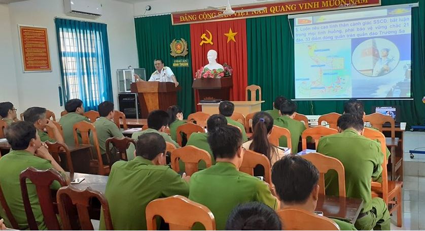 Chiều 13-6, tại Trung tâm Bồi dưỡng nghiệp vụ Công an tỉnh Bình Thuận, Lữ đoàn 681, Vùng 2 Hải quân tổ chức nói chuyện chuyên đề về biển, đảo cho hơn 100 cán bộ, đảng viên thuộc lớp đối tượng 4, Công an tỉnh Bình Thuận.