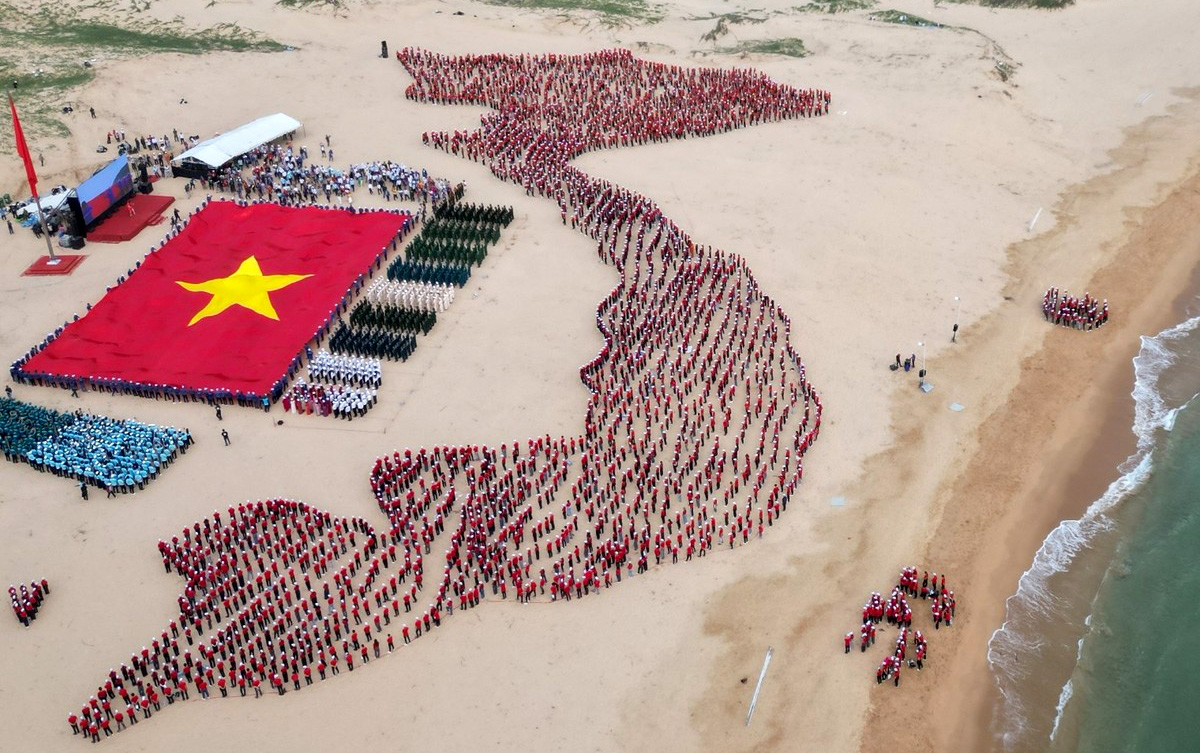 Trong sắc áo cờ đỏ sao vàng, hơn 3.200 đoàn viên thanh niên và học sinh tỉnh Phú Yên đã sắp xếp thành dáng hình đất nước Việt Nam thu nhỏ cùng 2 quần đảo Hoàng Sa và Trường Sa thân yêu.