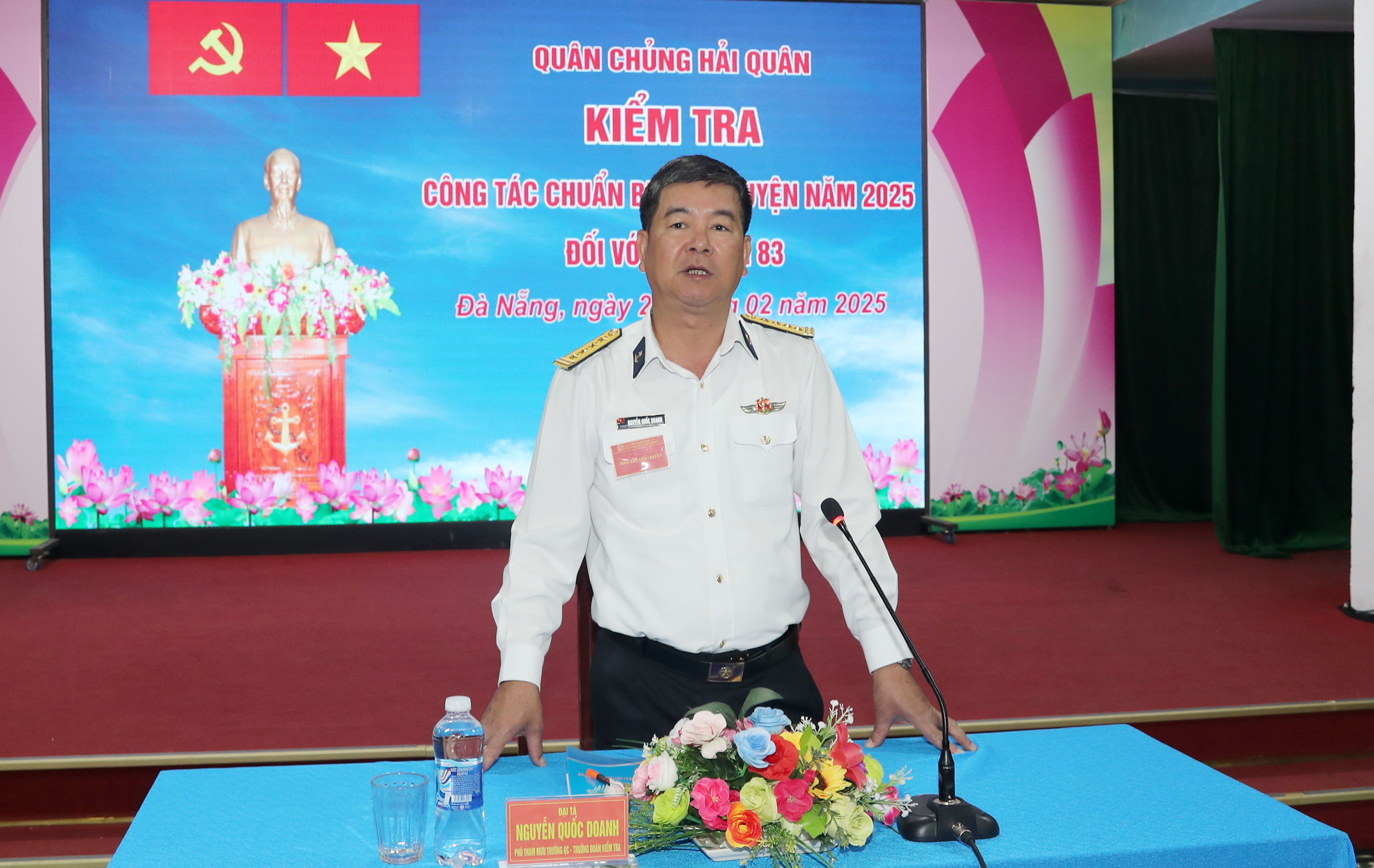Sáng 22/2, tại TP. Đà Nẵng, Quân chủng Hải quân tổ chức kiểm tra công tác chuẩn bị huấn luyện năm 2025 tại Lữ đoàn Công binh 83 Hải quân. Đại tá Nguyễn Quốc Doanh, Phó Tham mưu trưởng Hải quân làm trưởng đoàn kiểm tra. Cùng tham gia đoàn có Đại tá Nguyễn Công Thắng, Phó Chủ nhiệm Chính trị Hải quân.