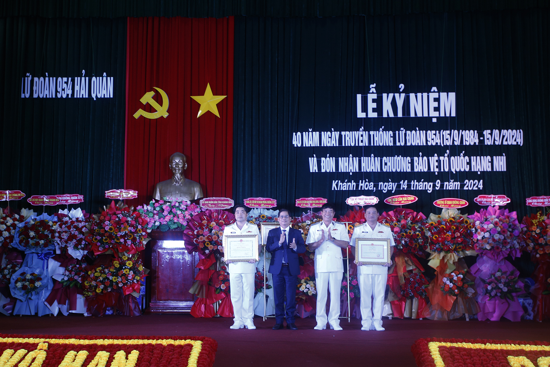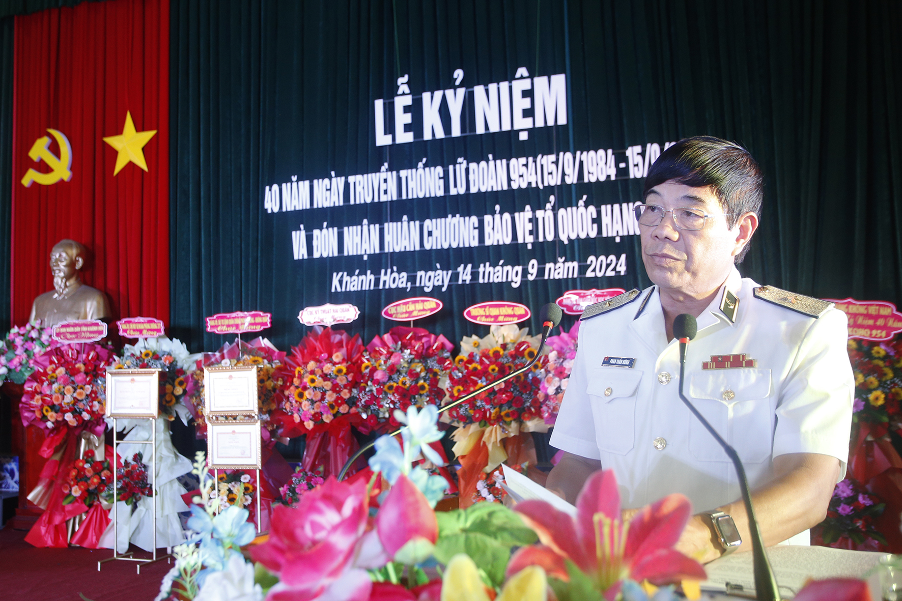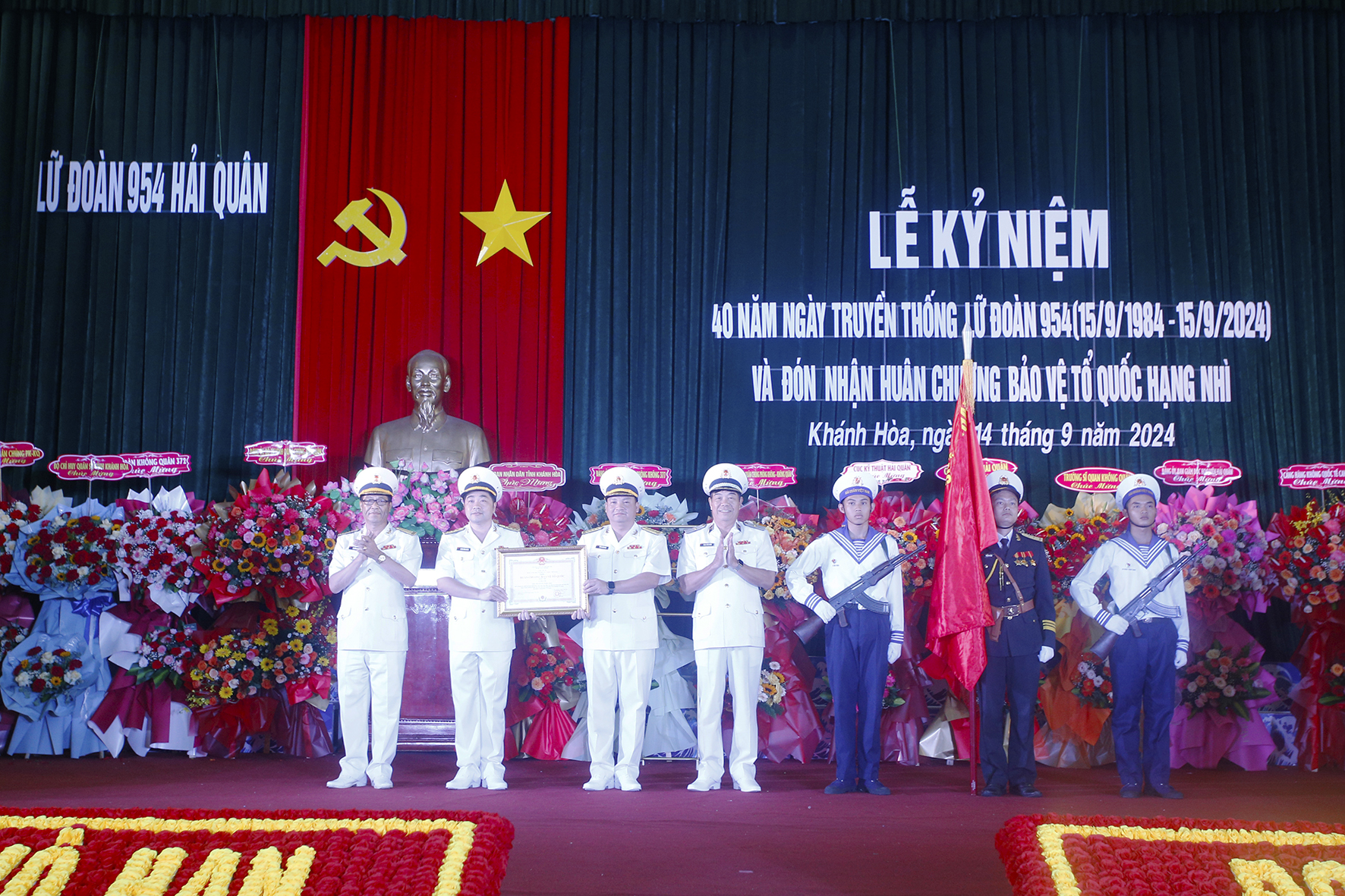 Sáng 14/9, tại TP. Cam Ranh, tỉnh Khánh Hòa, Lữ đoàn Không quân Hải quân 954 long trọng tổ chức Lễ kỷ niệm 40 năm Ngày truyền thống (15/9/1984-15/9/2024) và đón nhận Huân chương Bảo vệ Tổ quốc hạng Nhì. Tham dự lễ có Chuẩn Đô đốc Phan Tuấn Hùng, Phó Tư lệnh Hải quân; đồng chí Nguyễn Tấn Tuân, Phó Bí thư Tỉnh ủy, Chủ tịch UBND tỉnh Khánh Hòa.