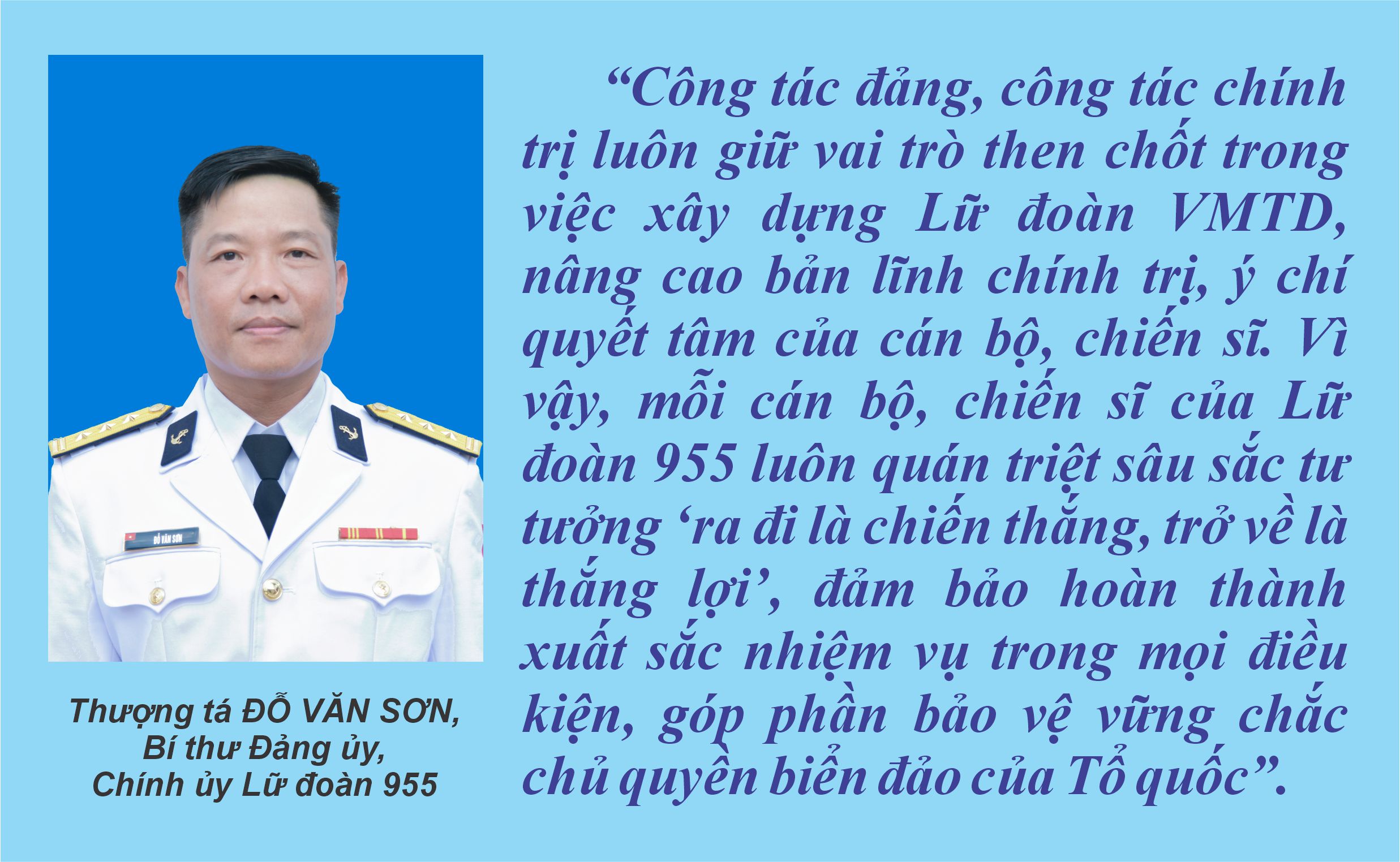 Hằng năm, Lữ đoàn 955 đều phối hợp với tỉnh Ninh Thuận triển khai chương trình “Hải quân Việt Nam làm điểm tựa cho ngư dân vươn khơi, bám biển”; phối hợp với Ban Tuyên giáo Tỉnh ủy Bình Phước tổ chức tuyên truyền biển đảo và thu hút nguồn nhân lực xây dựng Quân chủng Hải quân hiện đại. Những hoạt động này đã góp phần nâng cao nhận thức của cán bộ, đảng viên và nhân dân về chủ quyền biển đảo, về vai trò của bộ đội Hải quân trong bảo vệ chủ quyền biển đảo Tổ quốc.