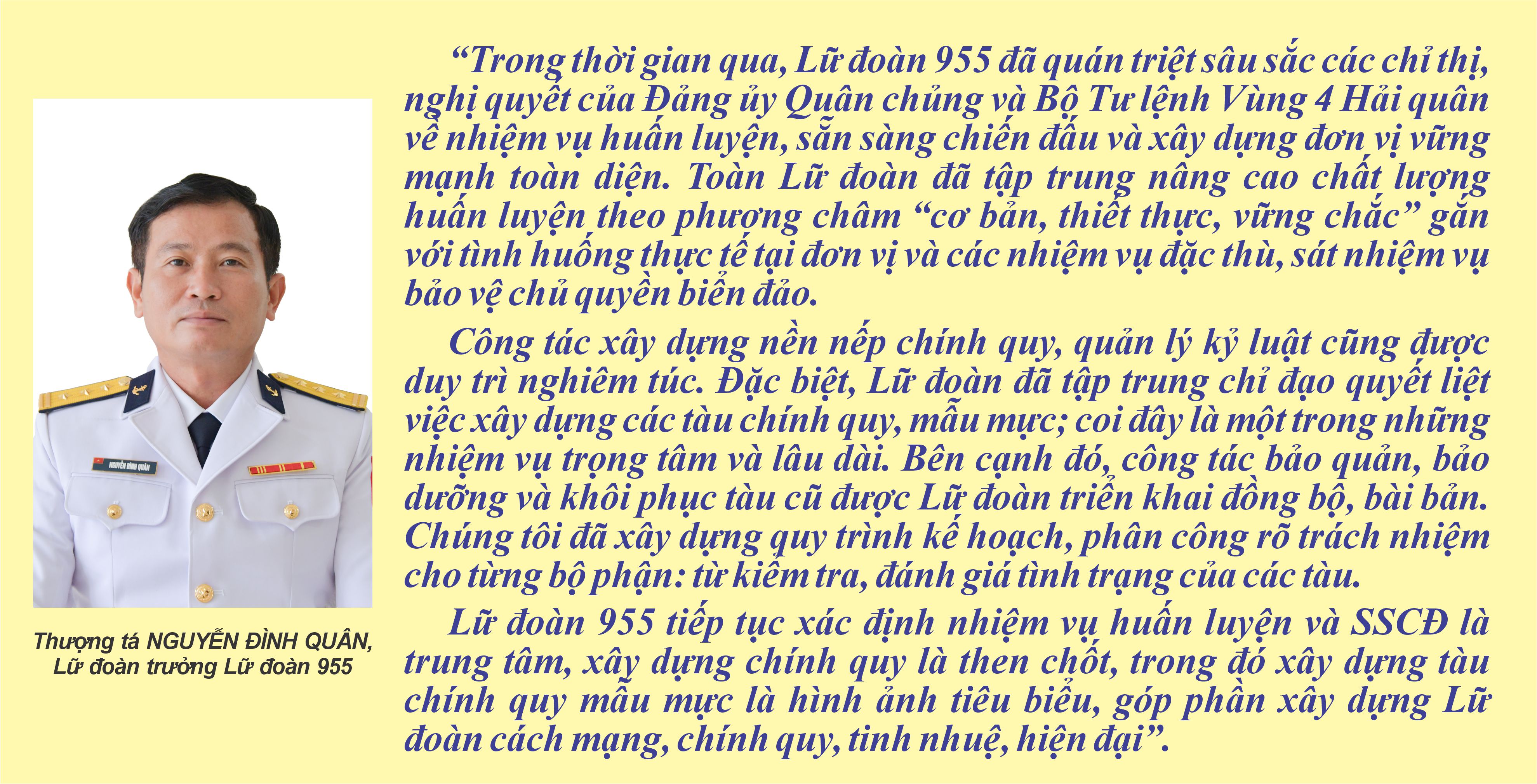 Ngày 26/4/2018, Lữ đoàn 955 thuộc Vùng 4 Hải quân chính thức được tái thành lập, trên cơ sở hợp nhất các hải đội tàu vận tải quan trọng. Mang trong mình sứ mệnh làm cầu nối đất liền với đảo xa, những năm qua, các thế hệ cán bộ, chiến sĩ Lữ đoàn 955 đã vượt qua khó khăn, hiểm nguy, hoàn thành xuất sắc nhiệm vụ trực chốt bảo vệ chủ quyền biển đảo, đồng thời tổ chức hàng trăm chuyến tàu đưa các đoàn công tác và hàng hóa từ đất liền đến đảo xa an toàn tuyệt đối.