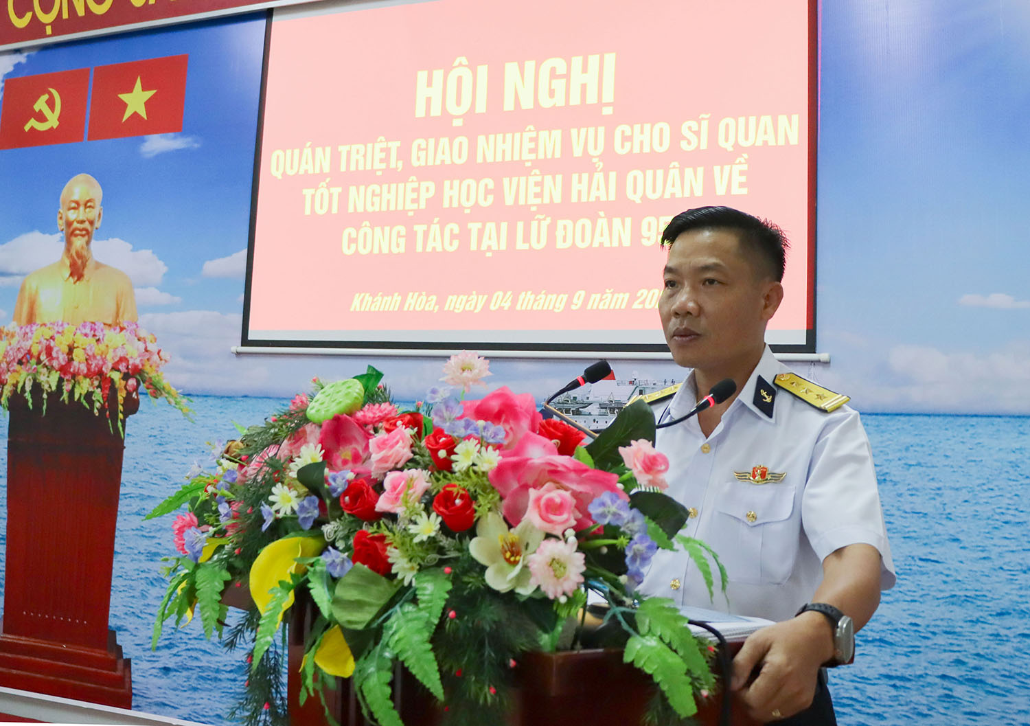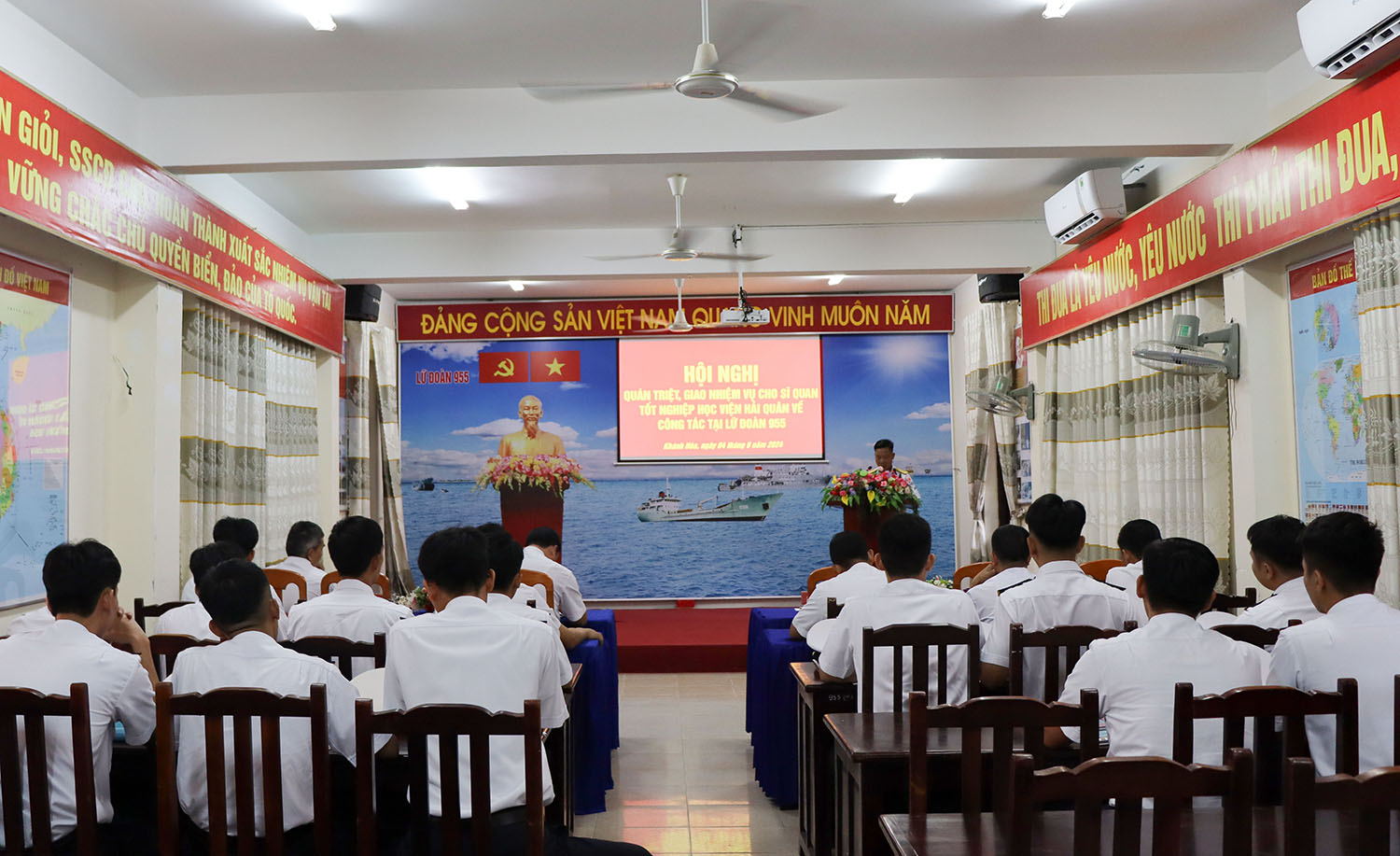 Chiều 4/9, Lữ đoàn 955, Vùng 4 Hải quân tổ chức Hội nghị quán triệt, giao nhiệm vụ cho sĩ quan tốt nghiệp Học viện Hải quân về nhận công tác tại đơn vị. Thượng tá Đỗ Văn Sơn, Chính ủy Lữ đoàn chủ trì.